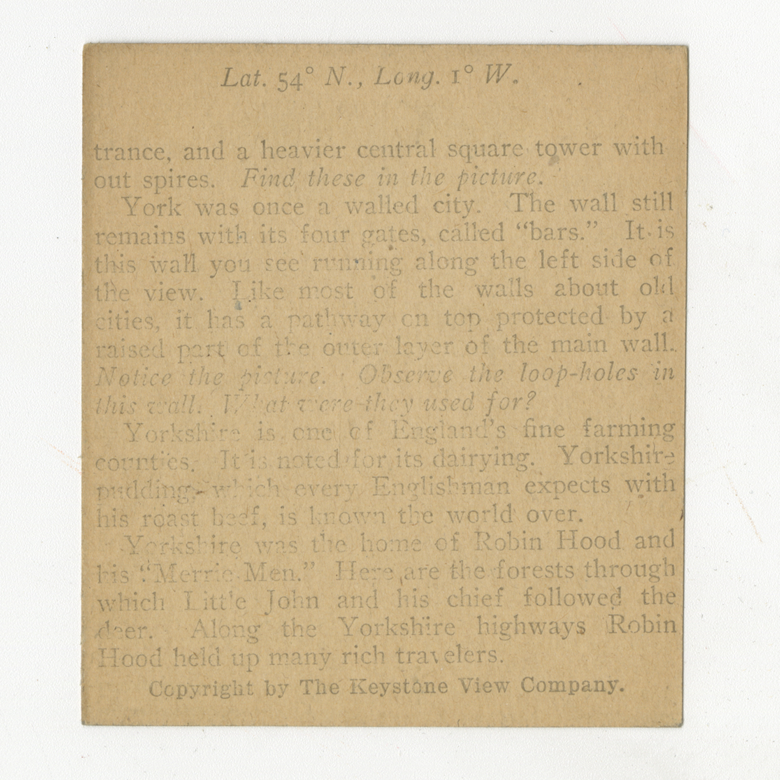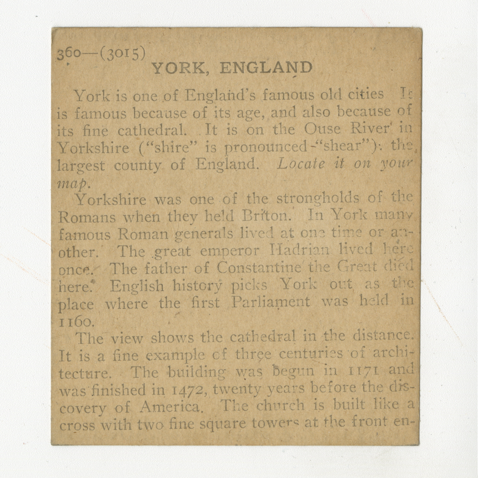 York is one of England's famous old cities. It is famous because of its age, and also because of its fine cathedral. It is on the Ouse River in Yorkshire ("shire" is pronounced "shear") the largest county of England. Locate it on your map. Yorkshire was one of the strongholds of the Romans when they held Briton. IN York many famous Roman generals lived at one time or another. The great emporer Hadrian lived here once. The father of the Constantine the Great died here. English history picks York out as the place where the first Parliament was held in 1160. The view shows the cathedral in the distance. It is a fine example of three centuries of architecture. The buildings was begun in 1171 and was finished in 1472, twenty years before the discovery of America. The church is built like a cross with two fine square towers at the front en-