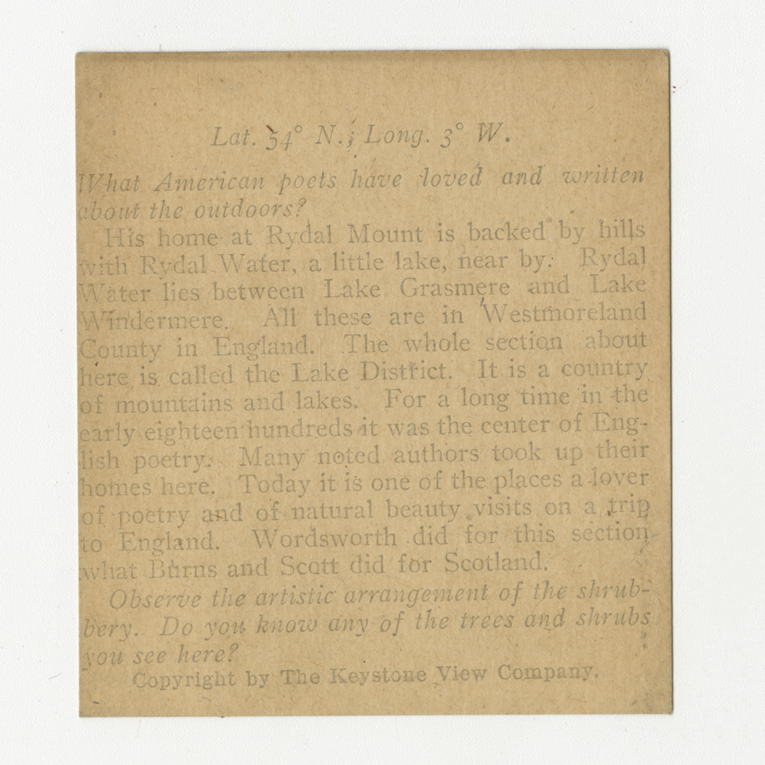 What American poets have loved and writeen about the outdoors? His home at Rydal Mount is backed by hills with Rydal Water, a little lake, near by. Rydal Water lies between Lake Grasmere and Lake Windermere. All these are in Westmoreland County in England. The whole section about here is called the Lake District. It is a county of mountains and lakes. For a long time in the early eighteenth hundreds it was the center of English poetry. Many noted authors took up their homes here. Today it is one of the places a lover of poetry and of natural beauty visits on a trip to England. Wordsworth did for this section what Burns and Scott did for Scott did for Scotland.