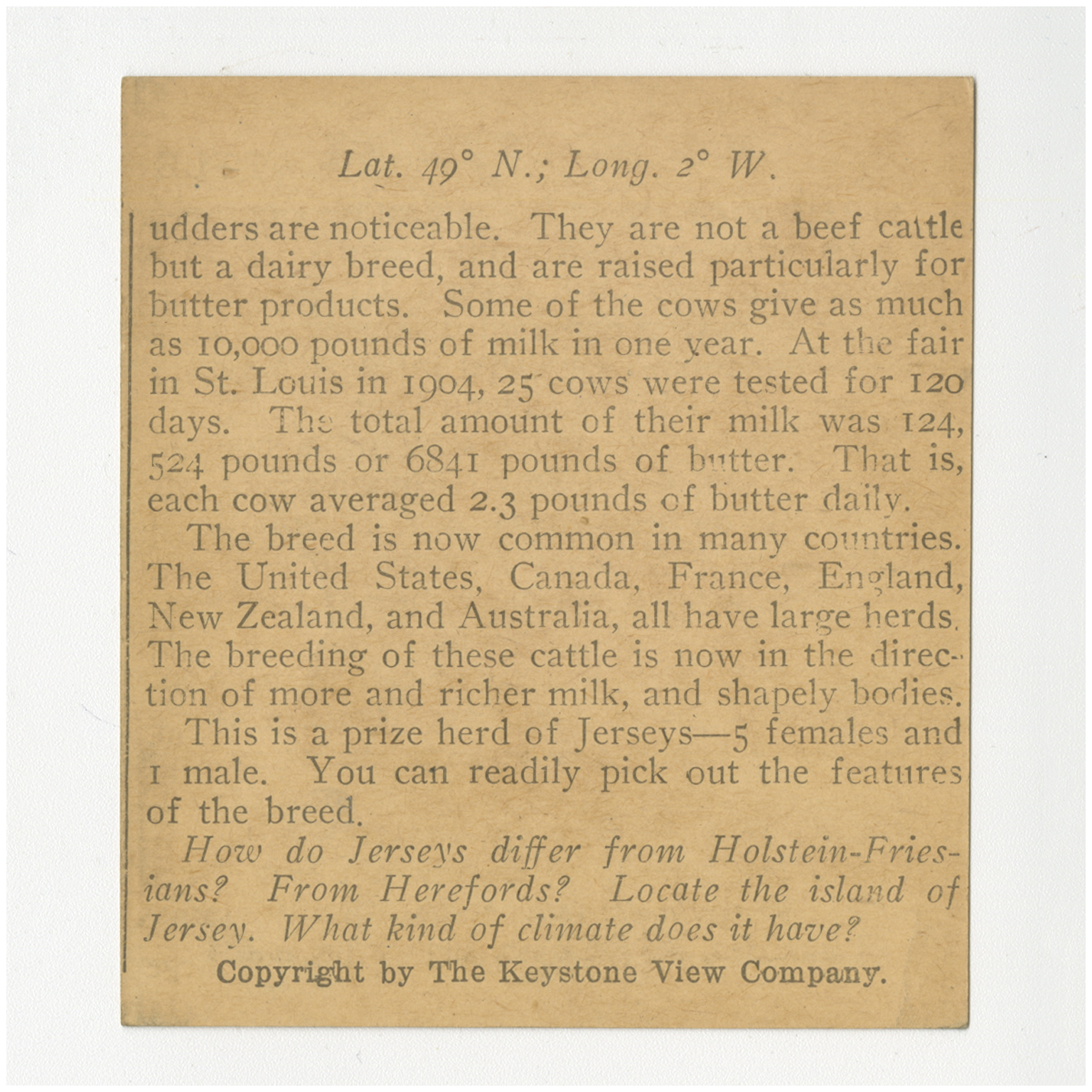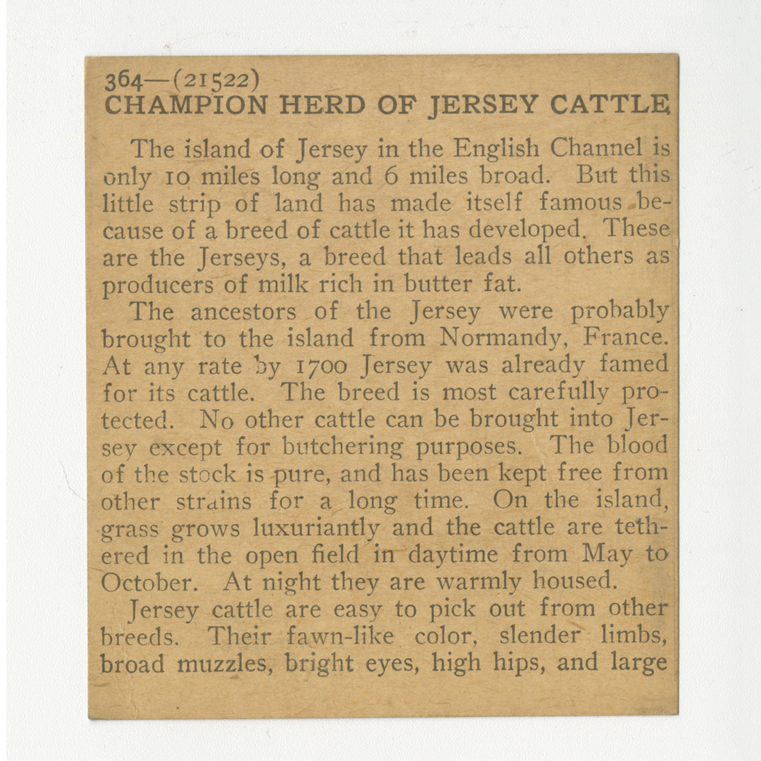 The island of Jersey in the English Channel is only 10 miles long and 6 miles broad. But this little strip of land has made itself famous because of a breed of cattle it has developed. These are the Jerseys, a breed that leads all others as producers of milk rich in butter fat. The ancestors of the Jersey were probably brought to the island from Normandy, France. At any rate by 1700 Jersey was already famed for its cattle. The breed is most carefully protected. No other cattle can be brought into Jersey except for butchering purposes. The blood of the stock is pure, and has been kept free from other strains for a long time. On the island, grass grows luxuriantly and the cattle are tethered in the open field in daytime from May to October. At night they are warmly housed. Jersey cattle are easy to pick out from other breeds. Their fawn-like color, slender limbs, broad muzzles, bright eyes, high hips, and large