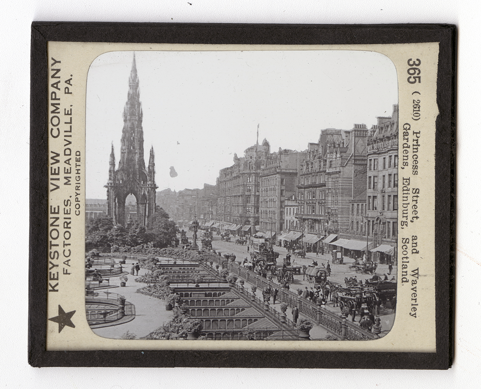 Princess Street is the pride of Edinburgh. It is one of the beautiful streets of the world. It is fitting that this finest street in Scotland should contain Scott's monument. The spire you see is built in his honor. A statue of the great writer stands in the open way the monument covers. Scott, as you know, is not buried here, but Edinburgh was Scott's home for many years. The beautiful Waverley Gardens, a park of flowers, you see to the left of Princess Street. What are they named after? About the Gardens are the chief buildings of Edinburgh. The Waverley Railway Station, the Royal Institution, and the National Gallery are all close at hand. The Waverley Railway Station is the largest in the United Kingdom. It covers 23 acres of ground. Edinburgh was founded about 617 by a king of Northumbria, named Edwin. It is still Edwin's burgh. The town began about the old castle,