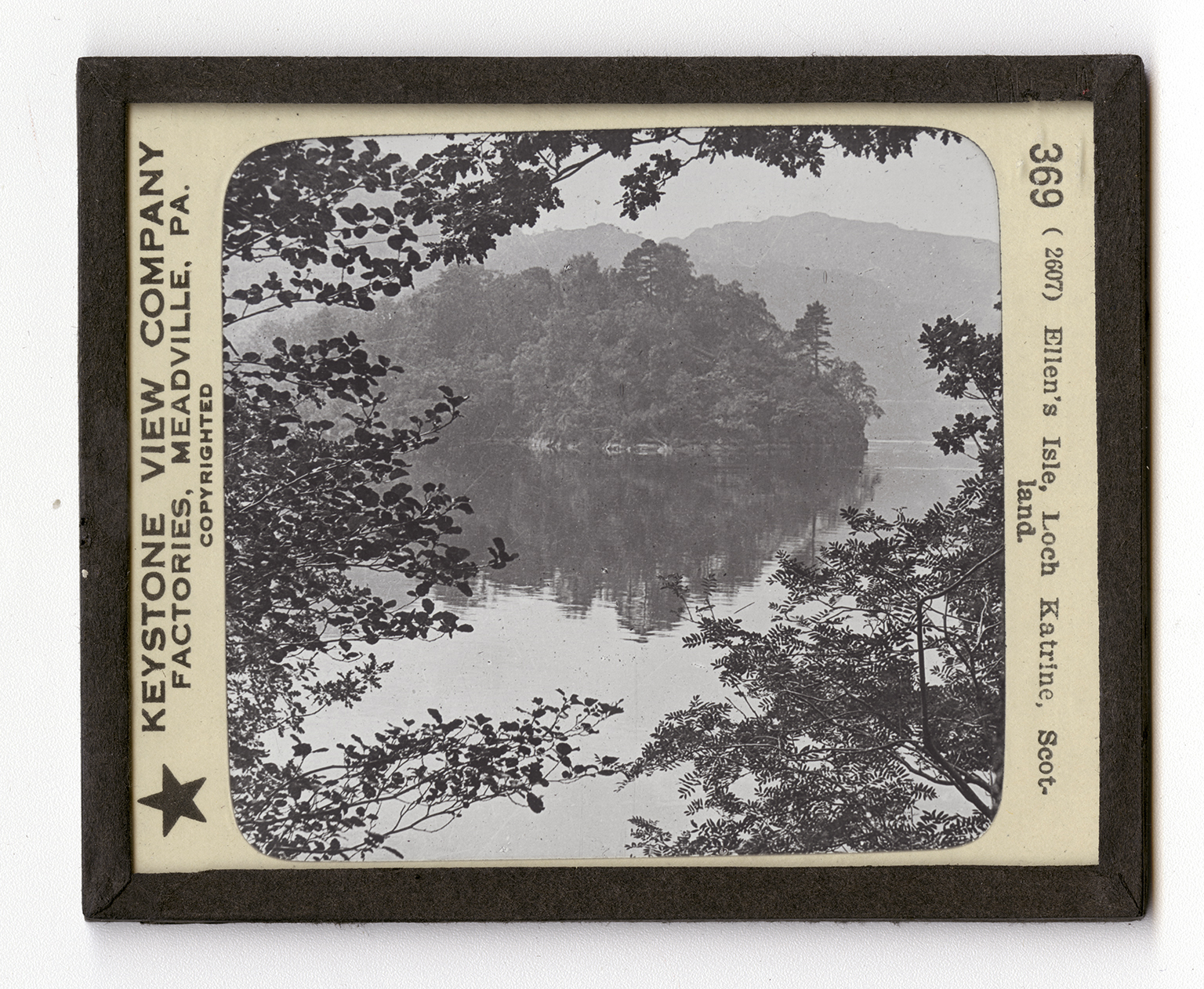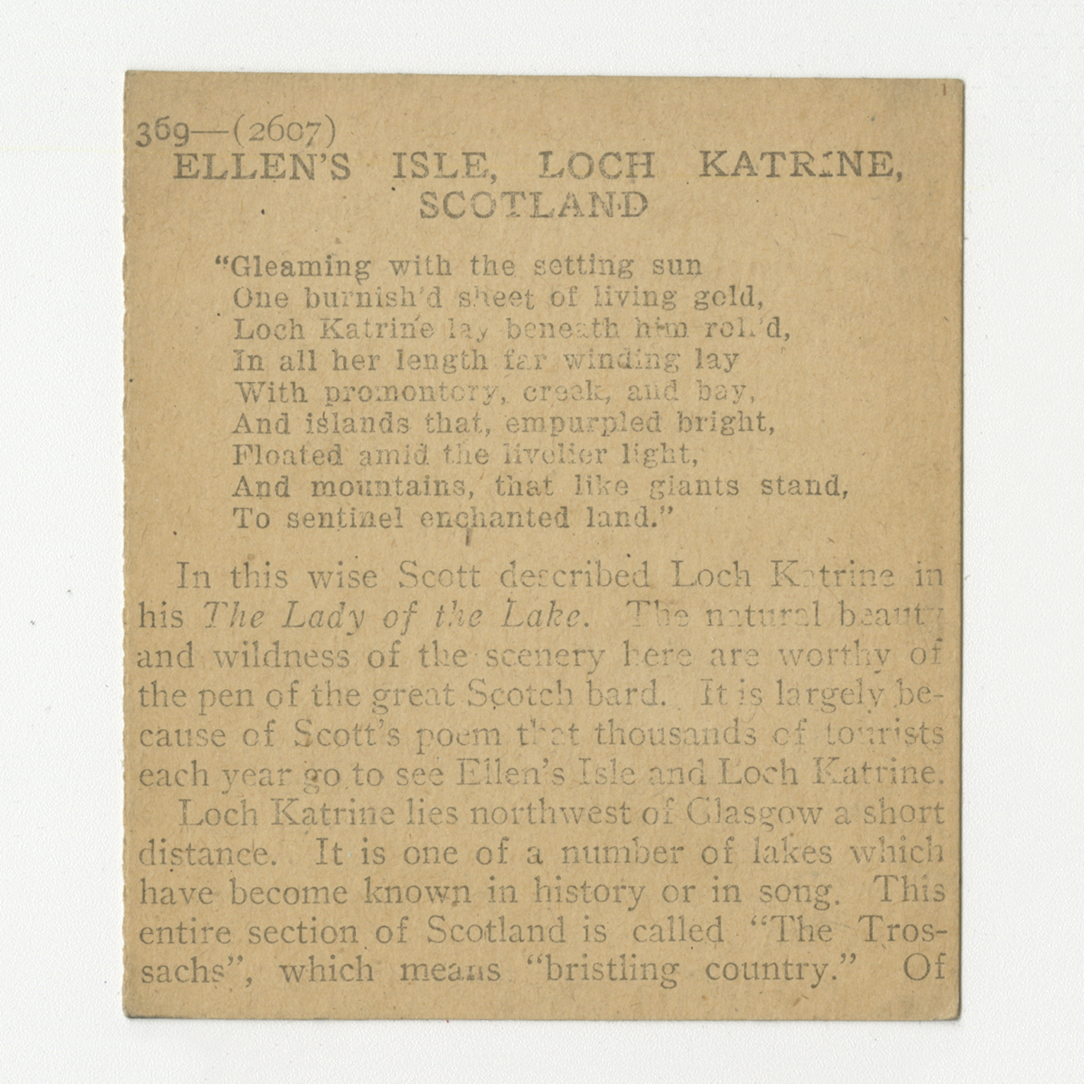 "Gleaming with the setting sun One burnish'd sheet of living gold, Lock Katrine lay beneath him roll'd, In all her lenght far winding lay With promontory, creek, and bay, And islands that, empurpled bright, Floated amid the livelier light, And mountains, that like giants stand, To sentinel enchanted land." In this wise Scott described Loch Katrine in his The Lady of the Lake. The natural beauty and wildness of the scenery here are worthy of the pen of the great Scotch bard. It is largely because of Scott's poem that thousands of tourists each year go to see Ellen's Isle and Loch Katrine. Loch Katrine lies northweast of Glasgow a short distance. It is one of a number of lakes which have become known in history or in song. This entire section of Scotland is called "The Trossachs", which means "bristling country." Of