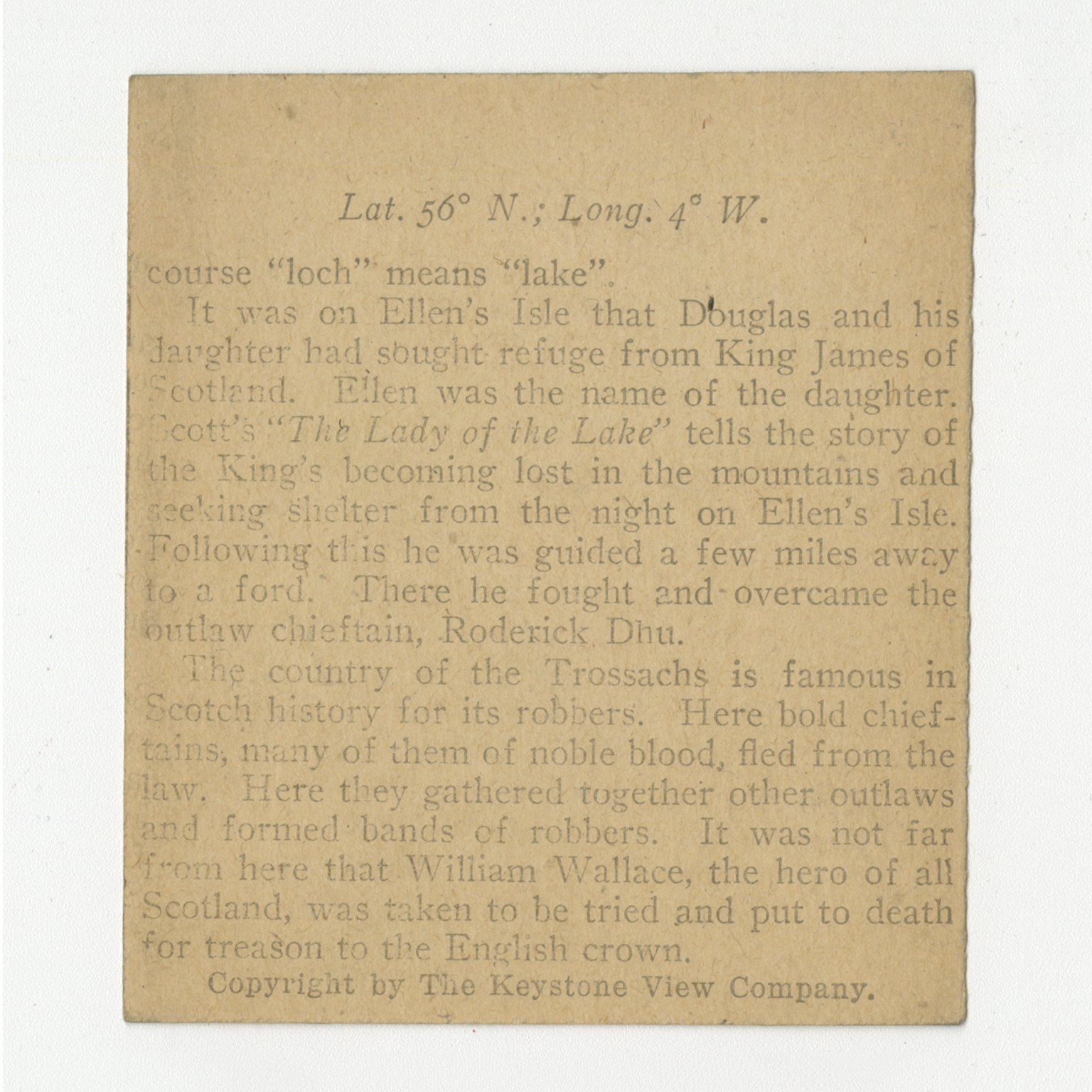 course "loch" means "lake". It was on Ellen's Isle that Douglas and his daughter had sought refuge from King James of Scotland. Ellen was the name of the daughter. Scott's "The Lady of the Lake" tells the story of the King's becoming lost in the mountains and seeking shelter from the night on Ellen's Isle. Following this he was guided a few miles away to a ford. There he fought and overcame the outlaw chieftain, Roderick Dhu. The country of the Trossachs is famous in Scotch history for its robbers. Here bold chieftains, many of them of noble blood, fled from the law. Here they gathered together other outlaws and formed bands of robbers. It was not far from here that William Wallace, the hero of all Scotland, was taken to be tried and put to death for treason to the English crown.