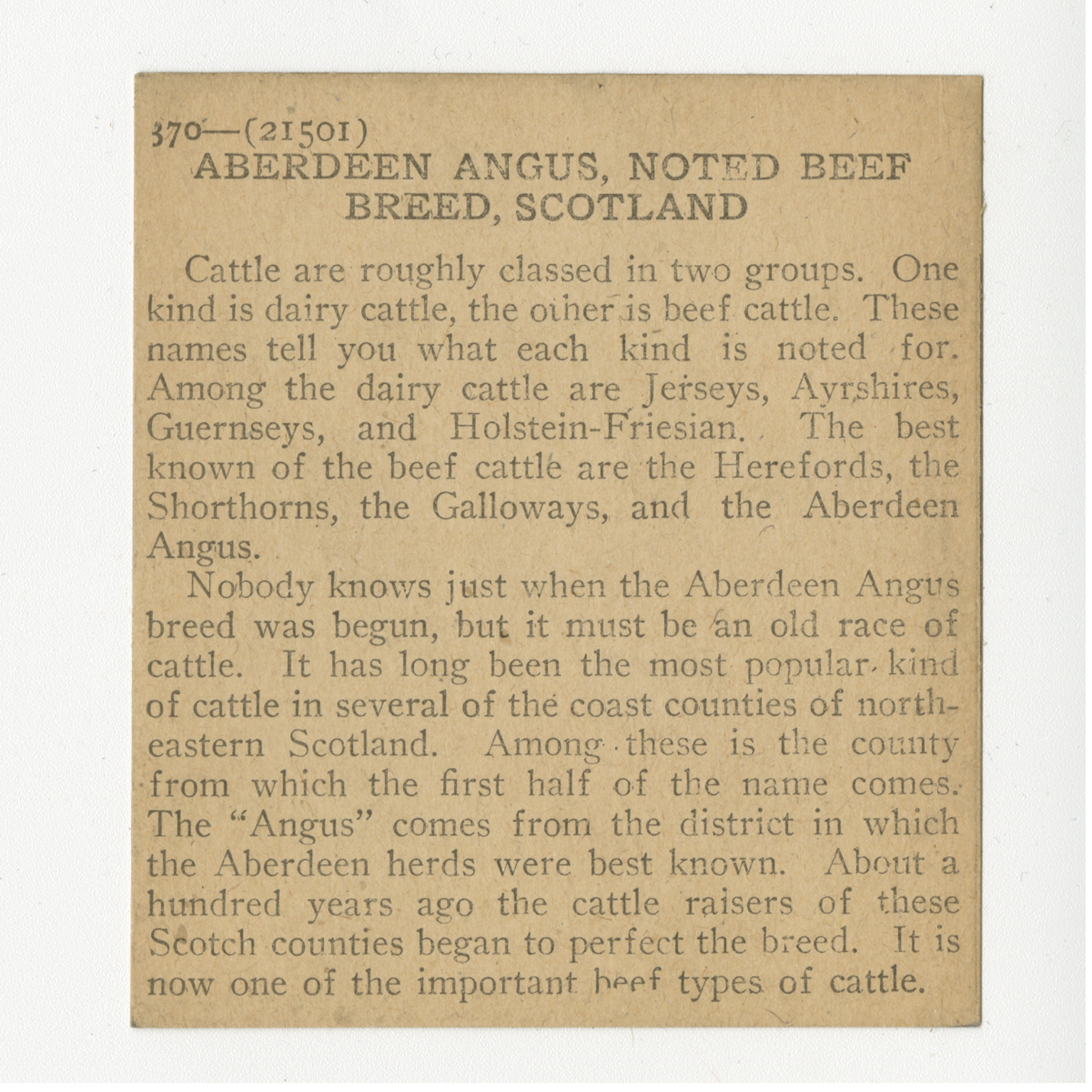 Cattle are roughly classed in two groups. One kind is dairy cattle, the other is beef cattle. These names tell you what each kind is noted for. Among the dairy cattle are Jerseys, Ayrshires, Guernseys, and Holstein-Friesian. The best known of the beef cattle are the Herefords, the Shorthorns, the Galloways, and the Aberdeen Angus. Nobody knows just when the Aberdeen Angus breed was begun, but it must be an old race of cattle. It has long been the most popular kind of cattle in several of the coast counties of northeastern Scotland. Among these is the county from which the first half of the name comes. The "Angus" comes from the district in which the Aberdeen herds were best known. About a hundred years ago the cattle raisers of these Scotch counties began to perfect the breed. It is now one of the important beef types of cattle.