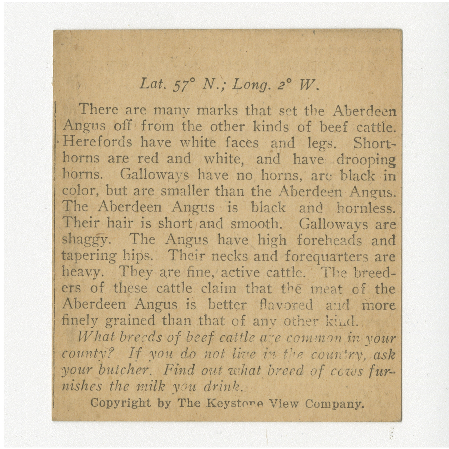 There are many marks that set the Aberdeen Angus off from the other kinds of beef cattle. Herefords have white faces and legs. Shorthorns are red and white, and have drooping horns. Galloways have no horns, are black in color, but are smaller than the Aberdeen Angus. The Aberdeen Angus is black and hornless. Their hair is short and smooth. Galloways are shaggy. The Angus have high foreheads and tapering hips. Their necks and forequarters are heavy. They are fine, active cattle. The breeders of these cattle claim that the meat of the Aberdeen Angus is better flavored and more finely grained than that of any other kind. What breeds of beef cattle are common in your county? If you do not live in the country, ask your butcher. Find out what breed of cows furnishes the milk you drink.