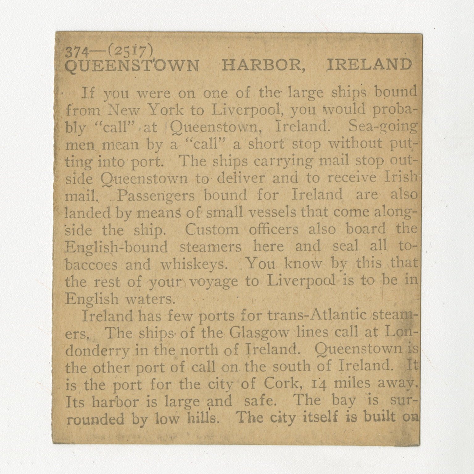 If you were on one of the large ships bound from New York to Liverpool, you would probably "call" at Queenstown, Ireland. Sea-going men mean by a "call" a short stop without putting into port. The ships carrying mail stop outside Queenstown to deliver and to receive Irish mail. Passengers bound for Ireland are also landed by means of small vessels that come alongside the ship. Custom officers also board the English-bound steamers here and seal all tobaccoes and whiskeys. You know by this that the rest of your voyage to Liverpool is to be in English waters. Ireland has few ports for trans-Atlantic steamers. The ships of the Glasgow lines call it Londonderry in the north of Ireland. Queenstown is the other port of call on the south of Ireland. It is the port for the city of Cork, 14 miles away. Its harbor is large and safe. They bay is surrounded by low hills. The city itself is built on