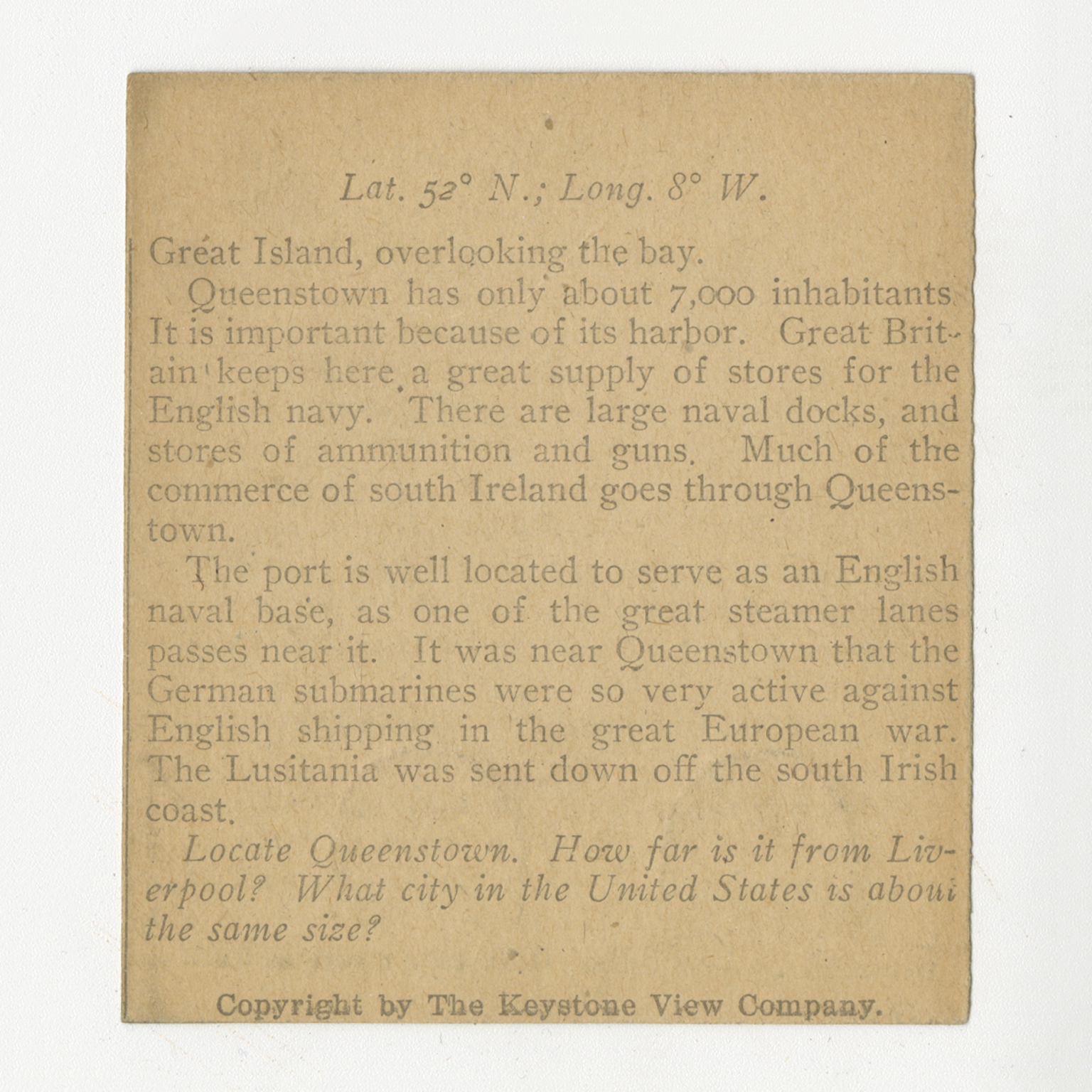 Great Island, overlooking the bay. Queenstown has only about 7,000 inhabitans. It is important because of its harbor. Great Britain keeps here a great supply of stores for the English navy. There are large naval docks, and stores of ammunition and guns. Much of the commerce of south Ireland goes through Queenstown. The port is well located to serve as an English naval base, as one of the great steamer lanes passes near it. It was near Queenstown that the German submarines were so very active against English shipping in the great European war. The Lusitana was sent down off the south Irish coast. Locate Queenstown. How far is it from Liverpool? What city in the United States is about the same size?