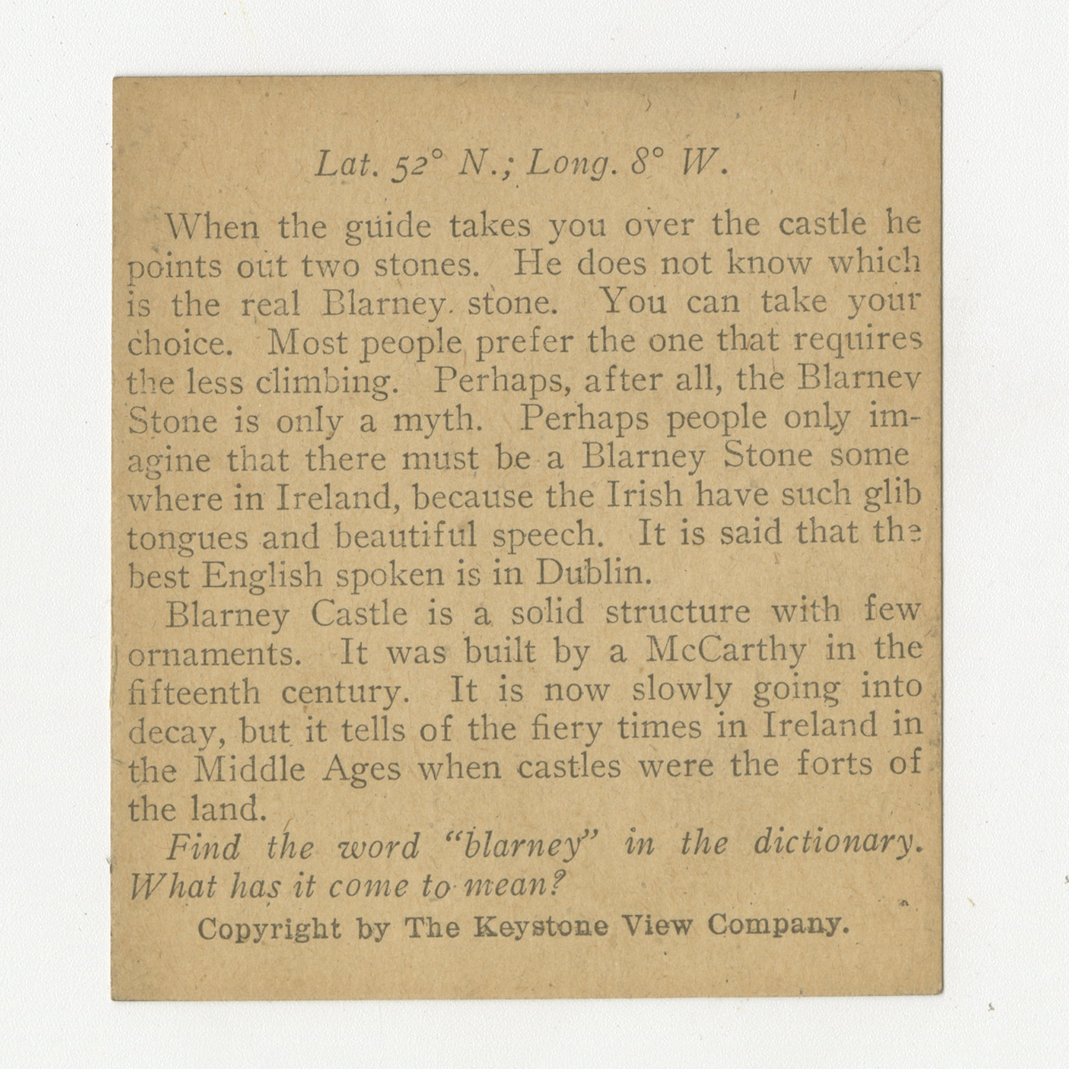 When the guide takes you over the castle he points out two stones. He does not know which is the real Blarney stone. You can take your choice. Most people prefer the one that requires the less climbing. Perhaps, after all, the Blarney Stone is only a myth. Perhaps people only imagine that there must be a Blarney Stone some where in Ireland, because the Irish have such glib tongues and beautiful speech. It is said that the best English spoken is in Dublin. Blarney Castle is a solid structure with few ornaments. It was built by a McCarthy in the fifteenth century. It is now slowly going into decay, but it tells of the fiery times in Ireland in the Middle Ages when castles were the forts the land. Find the word "blarney" in the dictionary. What has it come to mean?
