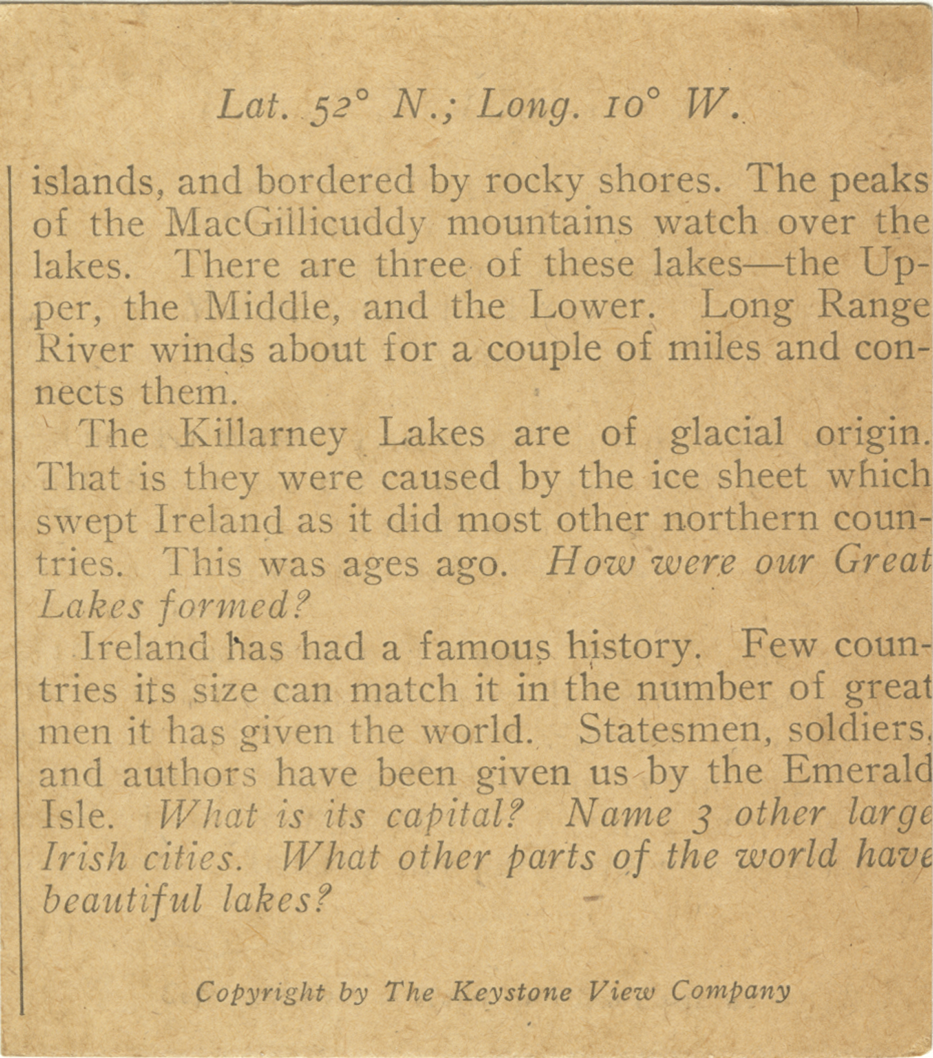 islands, and bothered by rocky shores. The peaks of the MacGillicuddy mountains watch over the lakes. There are three of these lakes - the Upper, the Middle, and the Lower. Long Range River winds about for a couple of miles and connects them. The Killarney Lakes are of glacial origin. That is, they were caused by the ice sheet which swept Ireland as it did most other northern countries. This was ages ago. How were our Great Lakes formed? Ireland has had a famous history. Few countries its size can match it in the number of great men it has given the world. Statesmen soldiers, and authors have been given us by the Emerald Isle. What is its capital? Name 3 other large Irish cities? What other parts of the world have beautiful lakes?
