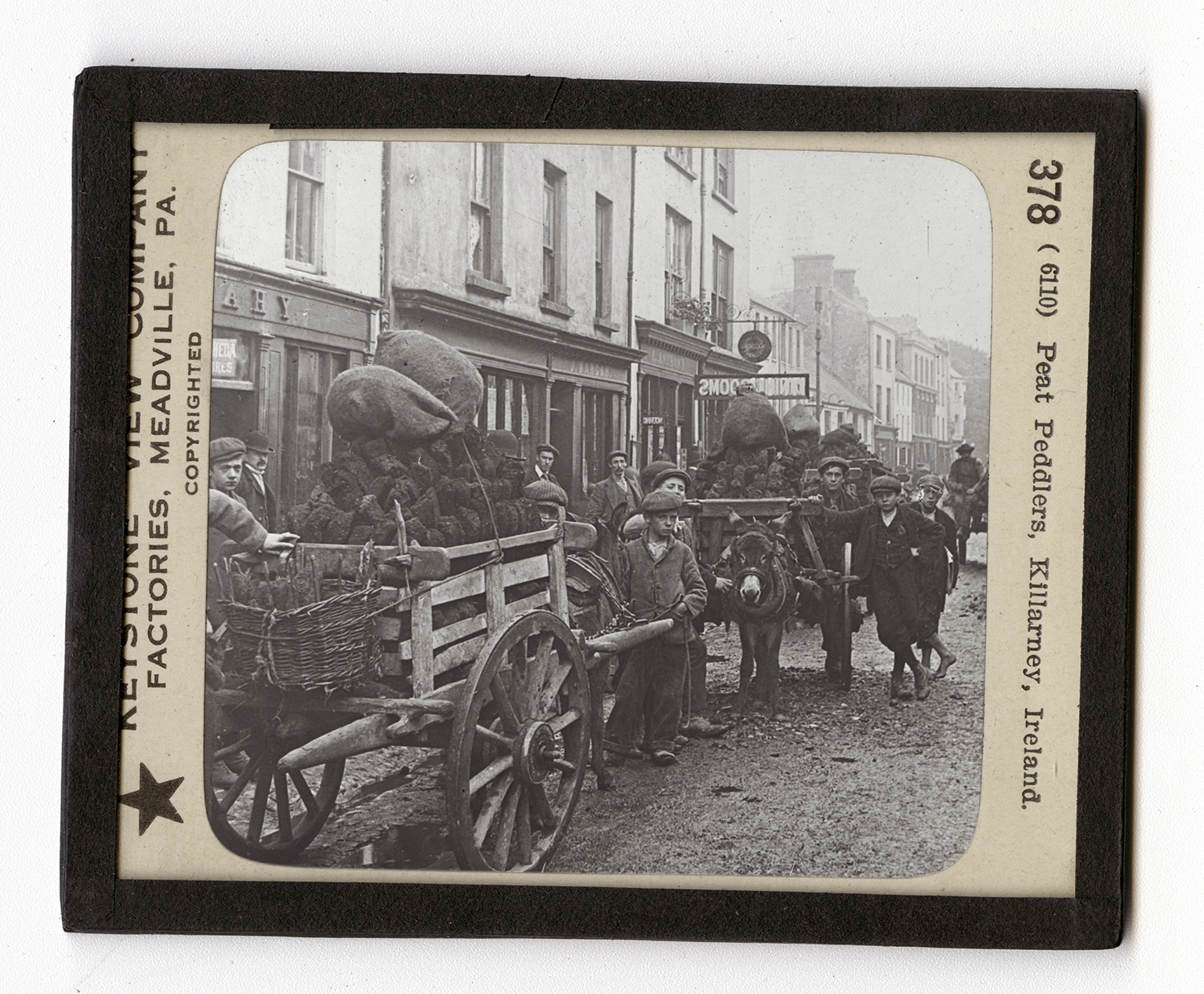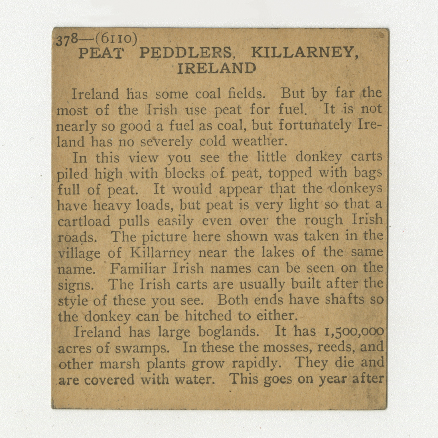 Ireland has some coal fields. But by far the most of the Irish use peat for fuel. It is not nearly so good a fuel as coal, but fortunately Ireland has no severely cold weather. In this view you see the little donkey carts piled high with blocks of peat, topped with bags full of peat. It would appear that the donkeys have heavy loads, but peat is very light so that a cartload pulls easily even over the rough Irish roads. The picture here shown was taken in the same village of Killarney near the lakes of the same name. Familiar Irish names can be seen on the signs. The Irish carts are usually built after the style of these you see. Both ends have shafts so the donkey can be hitched to either. Ireland has large boglands. It has 1,500,000 acres of swamps. In these the mosses, reeds, and other marsh plants grow rapidly. They die and are covered with water. This goes on year after