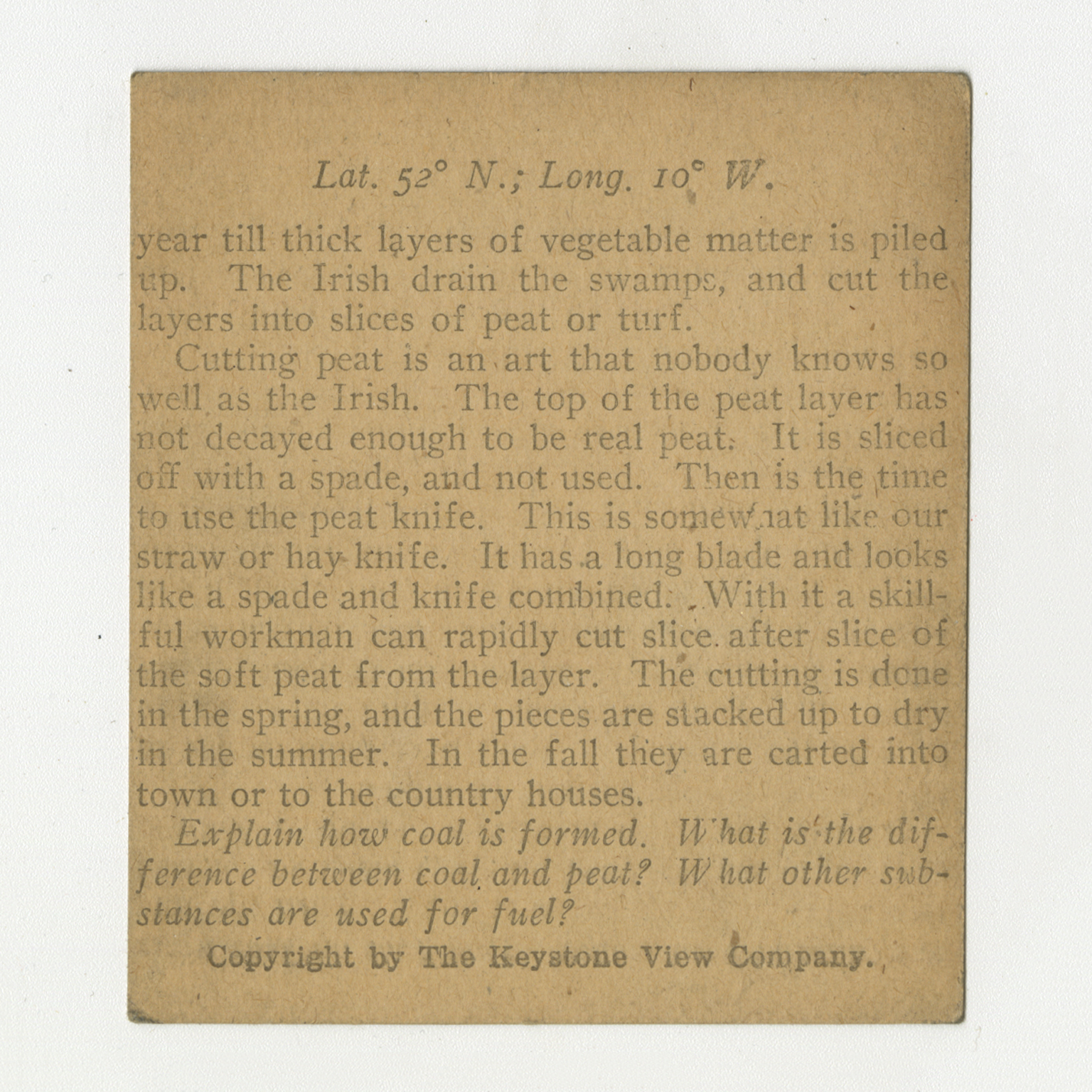 year till thick layers of vegetable matter is piled up. The Irish drain the swamps, and cut the layers into slices of peat or turf. Cutting peat is an art that nobody knows so well as the Irish. The top of the peat layer has not decayed enough to be real peat. It is sliced off with a spade, and not used. Then is the time to use the peat knife. This is somewhat like our straw or hay knife. It has a long blade and looks like a spade and knife combined. With it a skillful workman can rapidly cut slice after slice of the soft peat from the layer. The cutting is done in the spring, and the pieces are stacked up to dry in the summer. In the fall they are carted into town or to the country houses. Explain how coal is formed. What is the difference between coal and peat? What other substances are used for fuel?