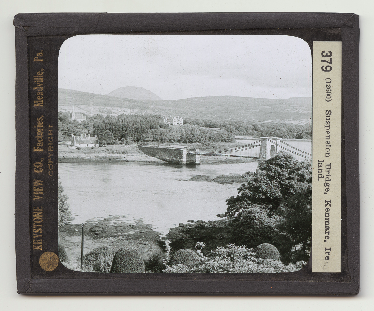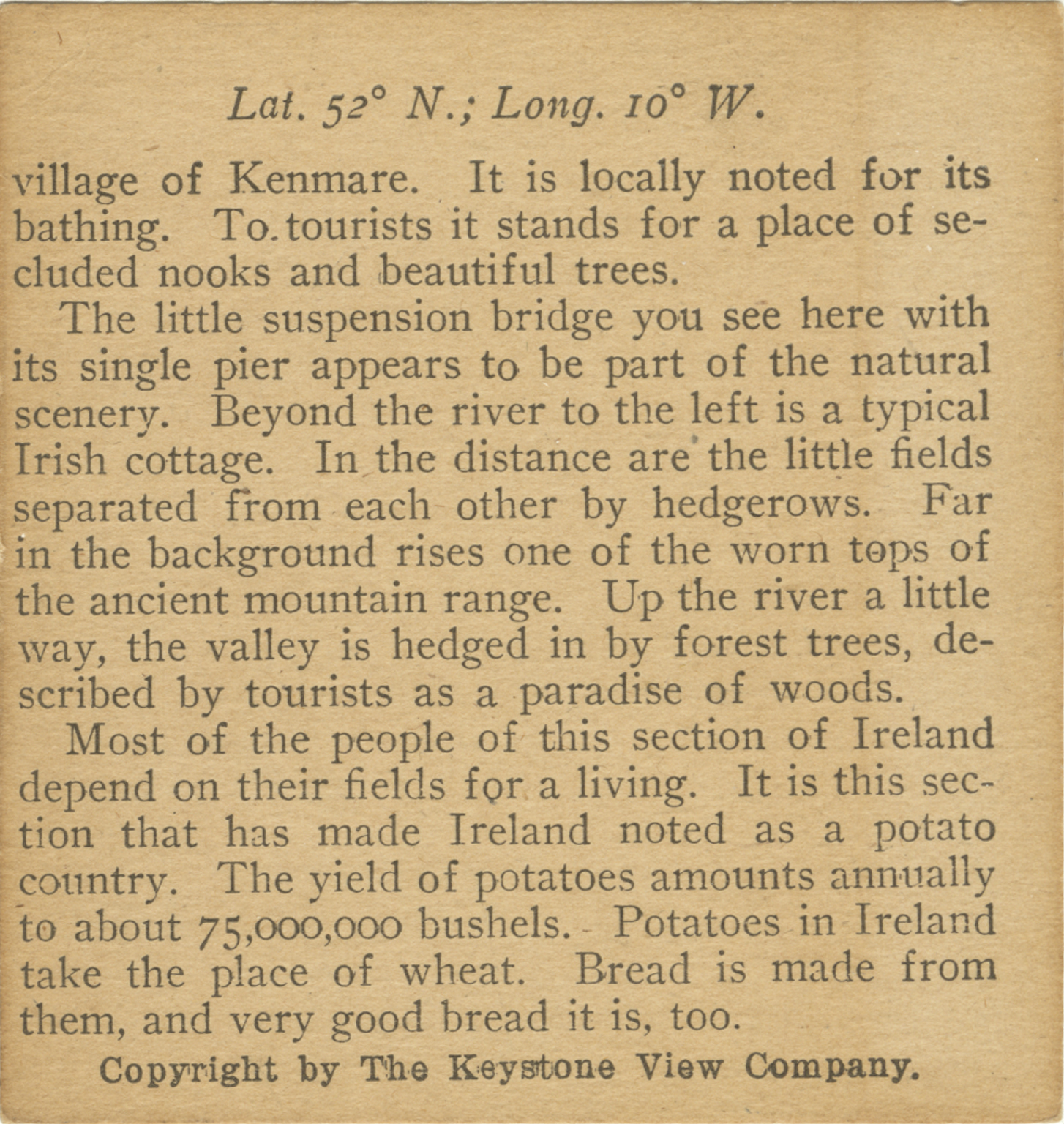 village of Kenmare. It is locally noted for its bathing. To tourists it stands for a place of secluded nooks and beautiful trees. The little suspension bridge you see here with its single pier appears to be part of the natural scenery. Beyond the river to the left is a typical Irish cottage. In the distance are the little fields separated from each other by hedgerows. Far in the background rises on of the worn tops of the ancient mountain range. Up the river a little way, the valley is hedged in by forest trees, described by tourists as a paradise of woods. Most of the people of this section of Ireland depend on their fields for a living. It is this section that has made Ireland noted as a potato country. The yield of potatoes amounts annually to about 75,000,000 bushels. Potatoes in Ireland take the place of wheat. Bread is made from them, and very good bread it is, too.