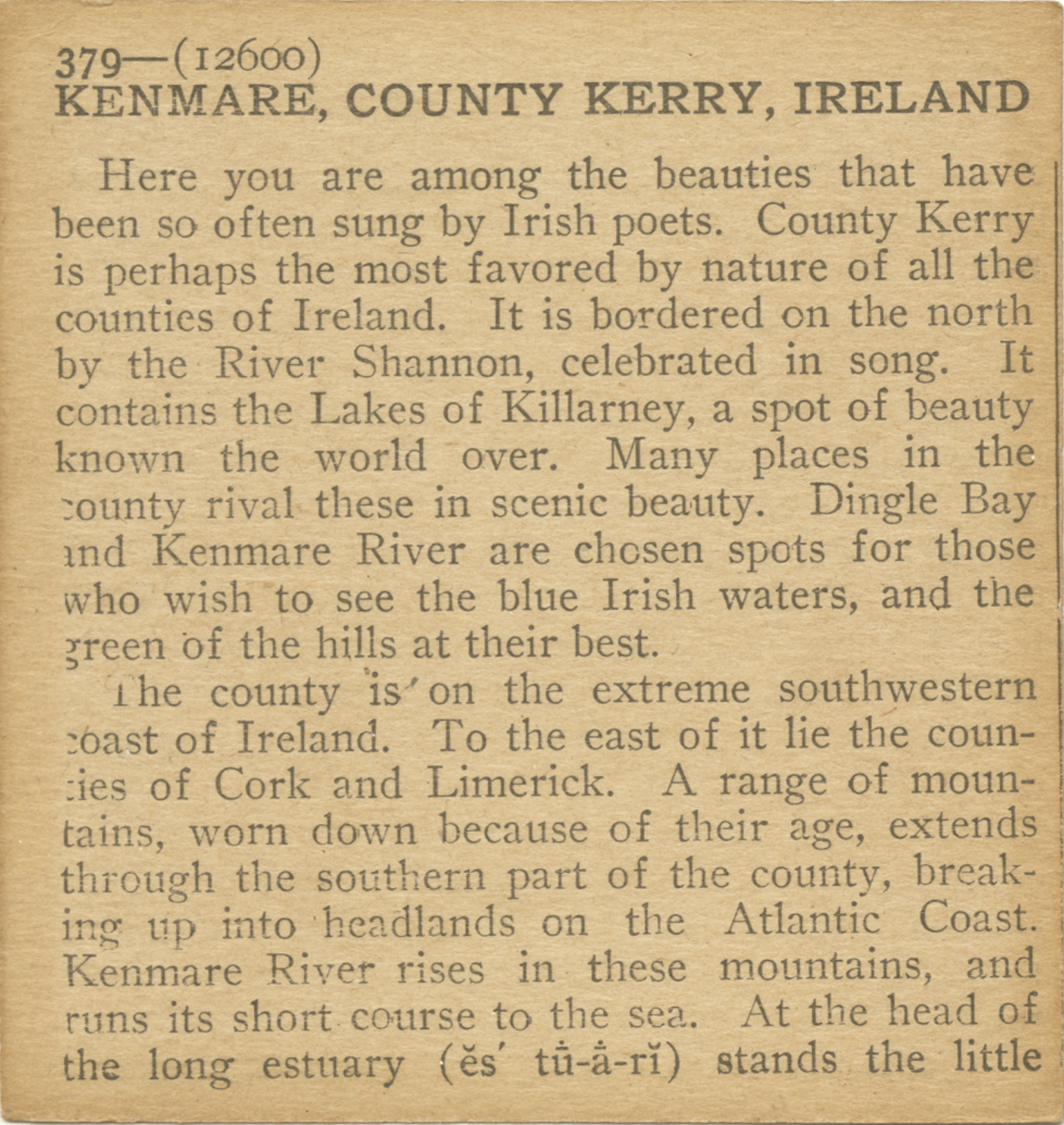 Here you are among the beauties that have been so often sung by Irish poets. County Kerry is perhaps the most favored by nature of all the counties of Ireland. It is bordered on the north by the River Shannon, celebrated in song. It contains the Lakes of Killarney, a spot of beauty known the world wover. Many palces in the county rival these in scenic beauty. Dingle Bay and Kenmare River are chosen spots for those who wish to see the blue Irish waters, and the green of the hills at their best. The county is one the extreme southwestern coast of Ireland. To the east of it lie the counties of Cork and Limerick. A range of mountains, worn down because of their age, extends through the southern part of the county, breaking up into headlands on the Atlantic Coast. Kenmare River rises in these mountains, and runs its short course to the sea. At the head of the long estuary stands the little