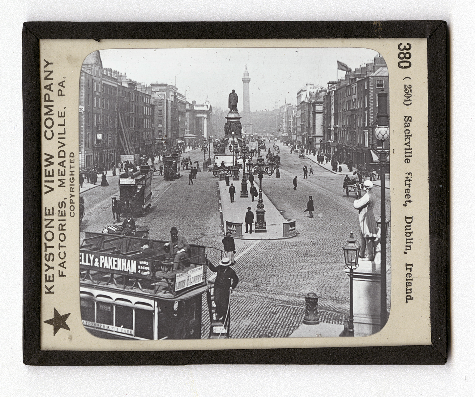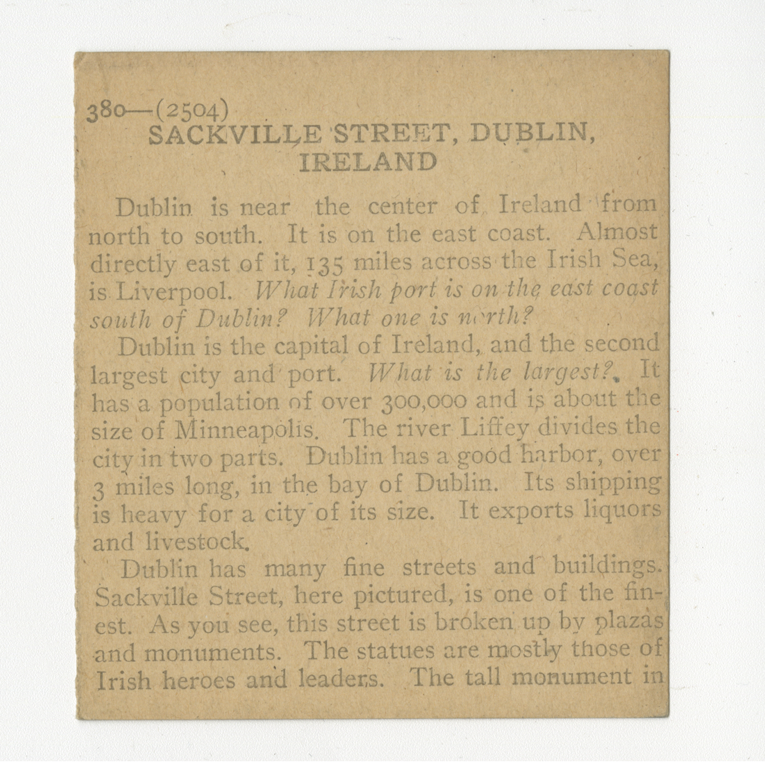 Dublin is near the center of Ireland from north to south. It is on the east coast. Almost directly east of it, 135 miles across the Irish Sea, is Liverpool. What Irish port is on the east coast south of Dublin? What one is north? Dublin is the capital of Ireland, and the second largest city and port. What is the largest? It has a population of over 300,000 and is about the size of Minneapolis. The river Liffey divides the city in two parts. Dublin has a good harbor, over 3 miles long, in the bay of Dublin. Its shipping is heavy for a city of its size. It exports liquours and livestock. Dublin has many fine streets and buildings, Sackville Street, here pictured, is one of the finest. As you see, this street is broken up by plazas and monuments. The statues are mostly those of Irish heroes and leaders. The tall monument in