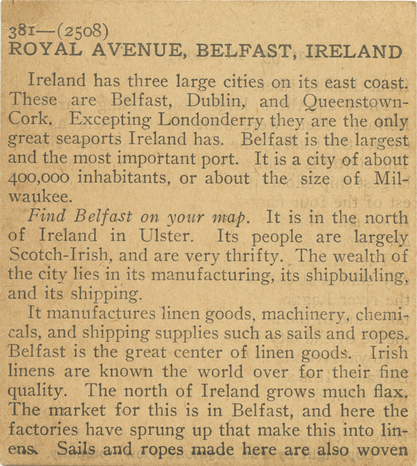 Ireland has three large cities on its east coast. These are Belfast, Dublin, and Queenstown-Cork. Excepting Londonderry they are the only great seaports Ireland has. Belfast is the largest and the most important port. It is a city of about 400,000 inhabitants, or about the size of Milwaukeee. Find Belfast on your map. It is in the north of Ireland in Ulster. Its people are largely Scotch-Irish, and are very thrifty. The wealth of the city lies in its manufacturing, its shipbuilding, and its shipping. It manufactures linen goods, machinery, chemicals, and shipping supplies such as sails and ropes. Belfast is the great center of linen foods. Irish linens are known the world over for their fine quality. The north of Ireland grows much flax. THe market for this is in Belfast, and here the factories have sprung up that make this into linens. Saisl and ropes made here are also woven