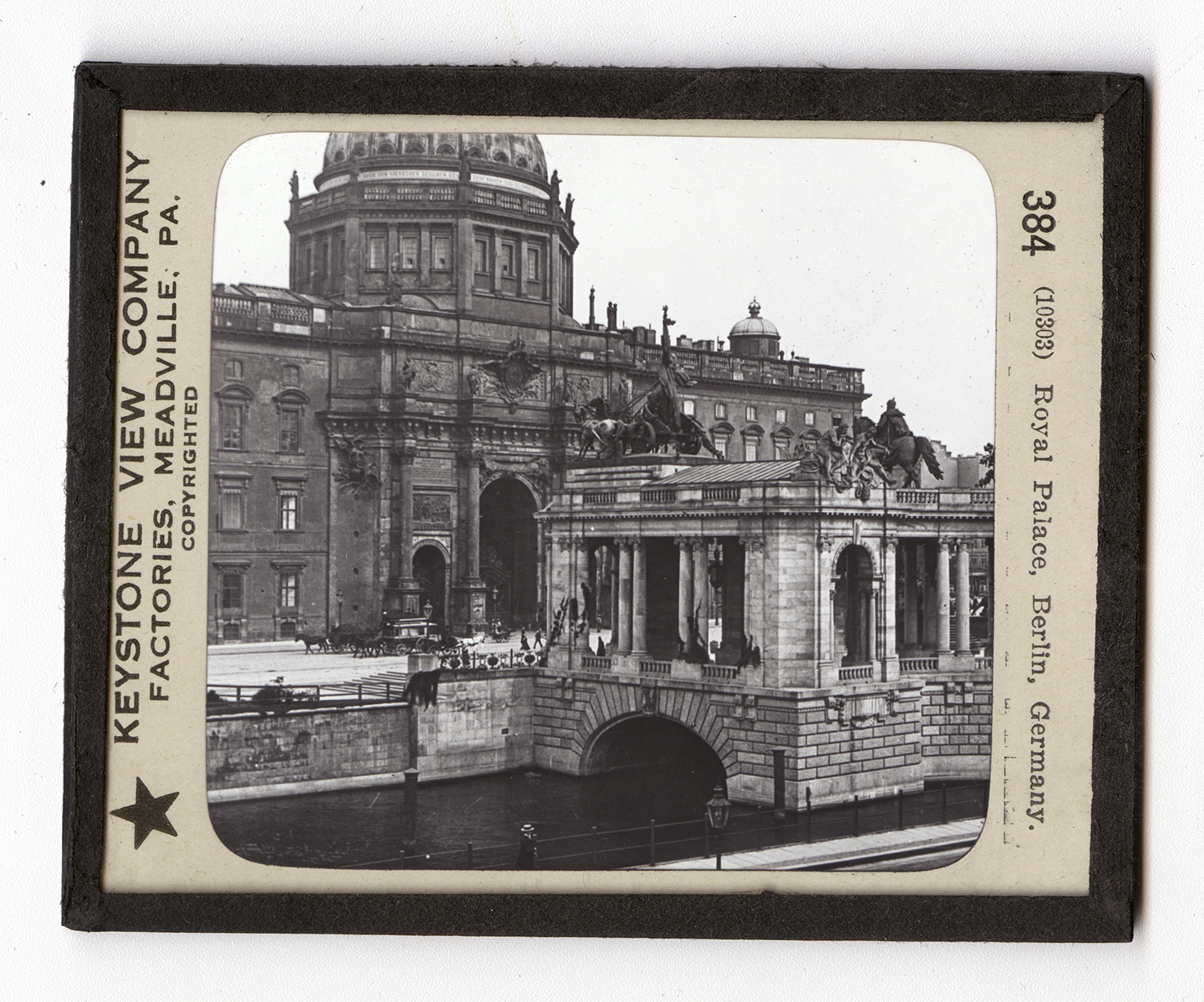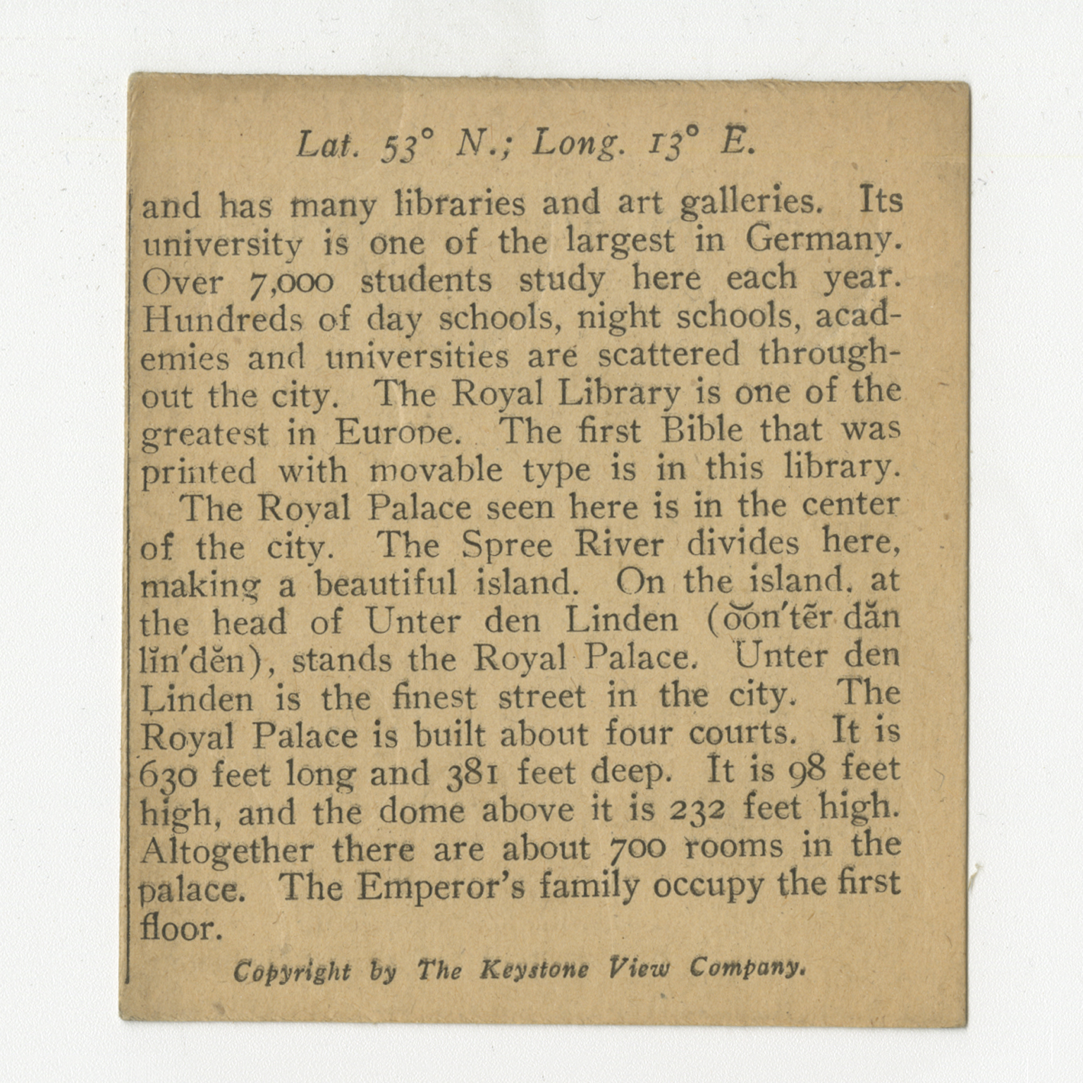 and has many libraries and art galleries. Its university is one of the largest in Germany. Over 7,000 students study here each year. Hundreds of day schools, night schools, academies and universities are scattered throughout the city. The Royal Library is one of the greatest in Europe. The first Bible that was printed with movable type is in this library. The Royal Palace seen here is in the center of the city. The Spree River divides here, making a beautiful island. On the island at the head of Unter den Linden, stands the Royal Palace. Unter den Linden is the finest street in the city. The Royal Palace is built about four courts. It is 630 feet long and 381 feet deep. It is 98 feet high, and the dome above it is 232 feet high. Altogether there are about 700 rooms in the palace. The Emperor's family occupy the first floor.