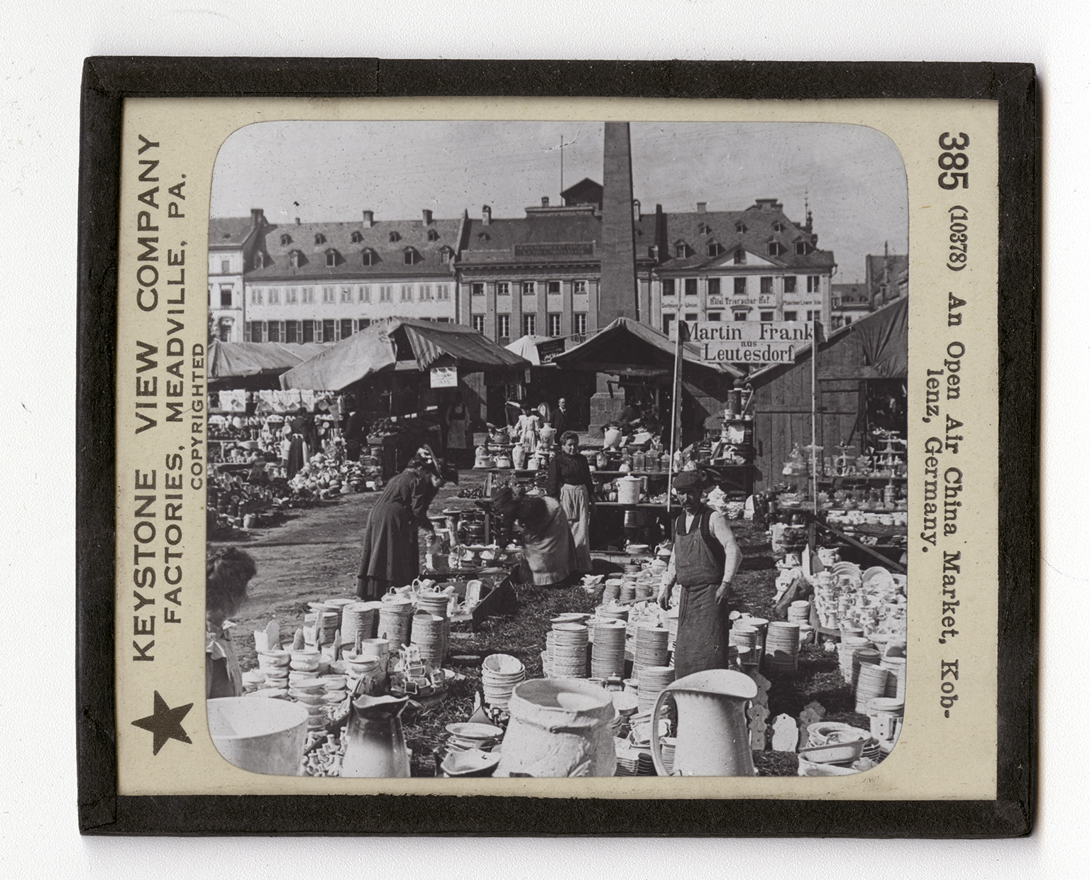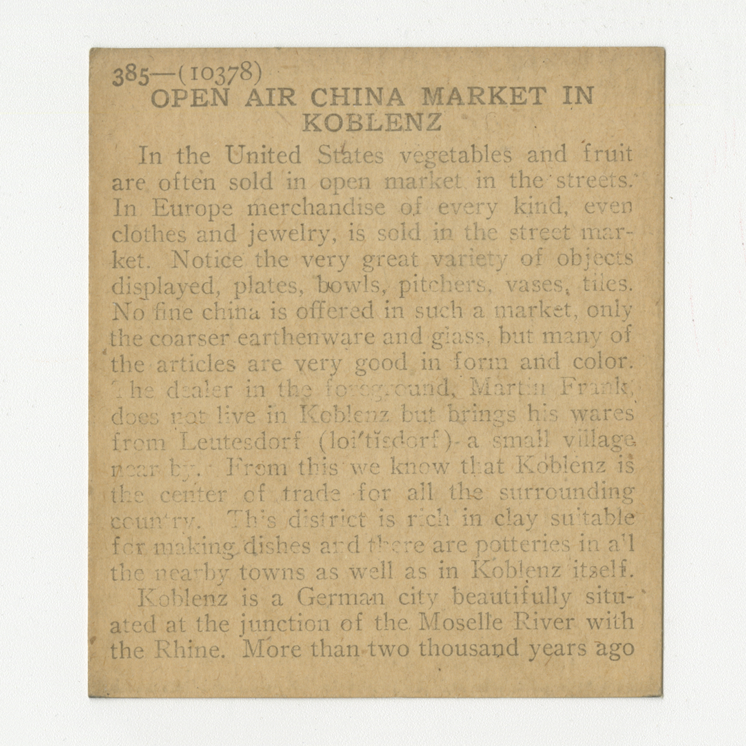 To the United States vegetables and fruit are often sold in open market in the streets. In Europe merchandise of every kind, even clothes and jewelry, is sold in the street market. Notice the very great variety of objects displayed, plates, bowls, pitchers, vases, tiles. No fine china is offered in such a market, only the coarser earthenware and glass, but many of the articles are very good in form and color. The dealer in the foreground, Martin Frank, does not live in Koblenz but brings his wares from Leutesdorf (loi'tisdorf) a small village near by. From this we know that Koblenz is the center of trade for all the surrounding country. This district is rich in clay suitable for making dishes and there are potteries in all the nearby towns as well as in Koblenz itself. Koblenz is a German city beautifully situated at the junction of the Moselle River with the Rhine. More that two thousand years ago