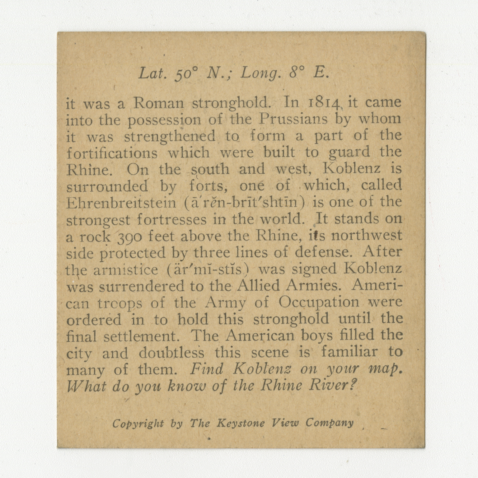 it was a Roman stronghold. In 1814 it came into the possession of the Prussians by whom it was strenghtened to form a part of the fortifications which were built to guard the Rhine. On the south and west, Koblenz is surrounded by forts, one of which, called Ehrenbreitstein is one of the strongest fortresses in the world. It stands on a rock 390 feet above the Rhine, its northwest side protected by three lines of defense. After th armistice (ar'mi-stis) was signed Koblenz was surrounded to the Allied Armies. American troops of the Army of Occupation were ordered in to hold this stronghold until the final settlement. The American boys filled the city and doubtless this scene is familiar to many of them. Find Koblens on your map. What do you know of the Rhine River?