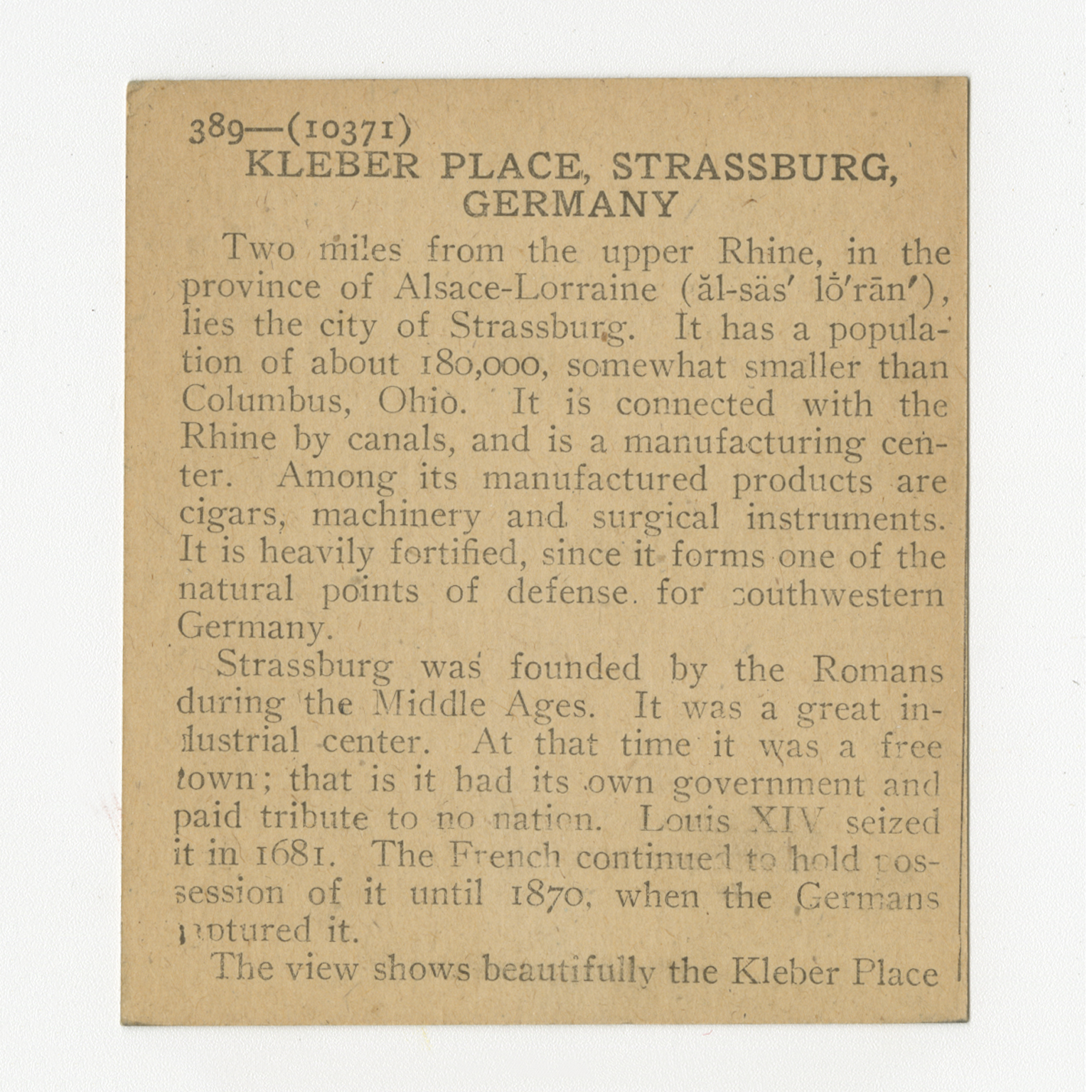 To miles from the upper Rhine, in the province of Alsace-Lorraine, lies the city of Strassburg. It has a population of about 180,000, somewhat smaller than Columbus, Ohio. It is connected with the Rhine by canals, and is a manufacturing center. Among its manufactured products are cigars, machinery and surgical instruments. It is heavily fortified, since it forms one of the natural points of defense for southwestern Germany. Strassburg was founded by the Romans during the Middle Ages. It was a great industrial center. At that time it was a free town; that is it had its own government and paid tribute to no nation. Louis XIV seized it in 1681. The French continued to hold possession of it until 1870, when the Germans captured it. The view shows beautifully the Kleber Place