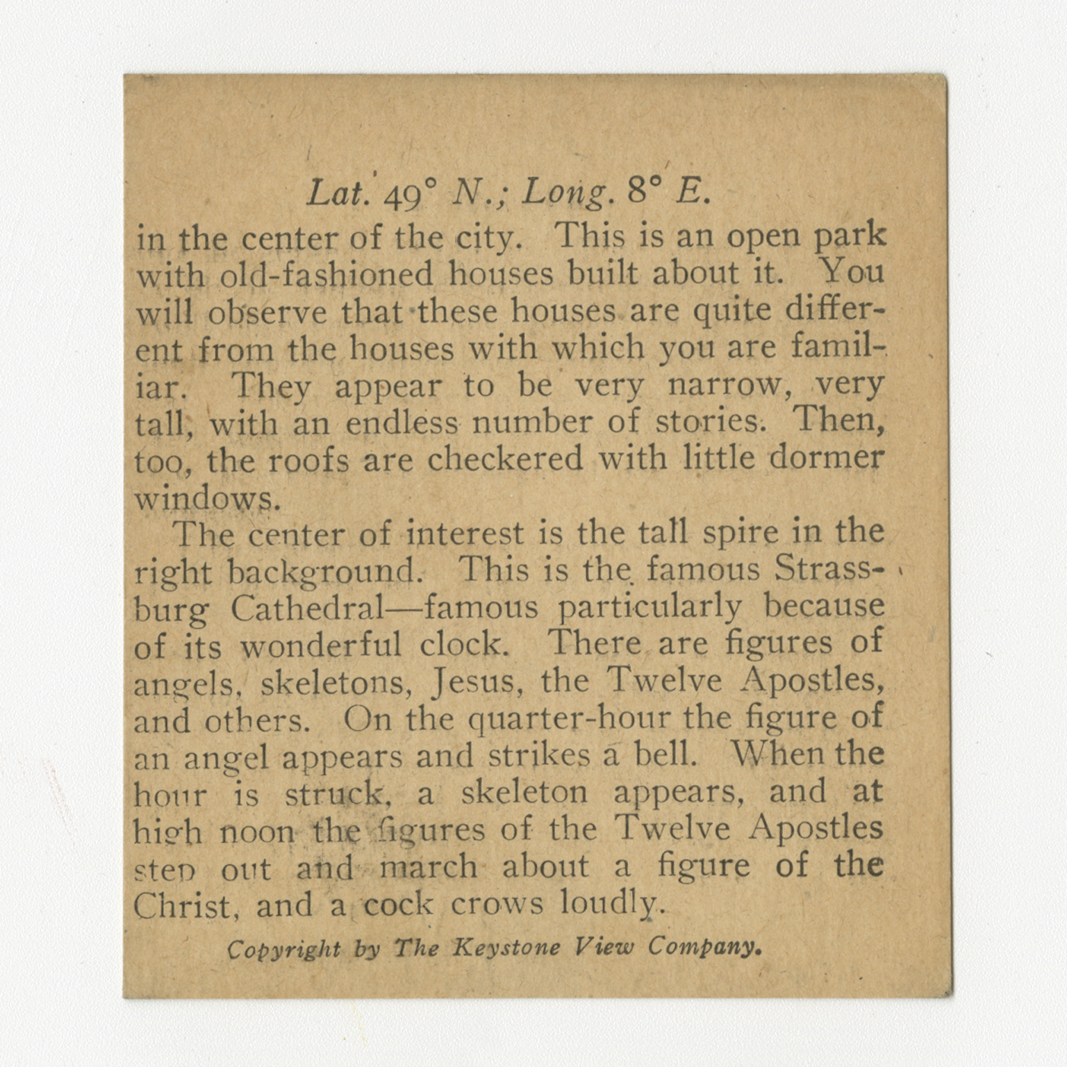 in the center of the city. This is an open park with old-fashioned house built about it. You will observe that these houses are quite different from the houses with which you are familiar. They appear to be very narrow, very tall, with an endless number of stories. Then, too, the roofs are checkered with little dormer windows. The center of interest is the tall spire in the right background. This is the famous Strassburg Cathedral--famous particularly because of its wonderful clock. There are figures of angels, skeletons, Jesus, the Twelve Apostles, and others. On the quarter-hour the figure of an angel appears and strikes a bell. When the hour is struck, a skeleton appears, and at high noon the figures of the Twelve Apostles step out and march about a figure of the Christ, and a cock crows loudly.
