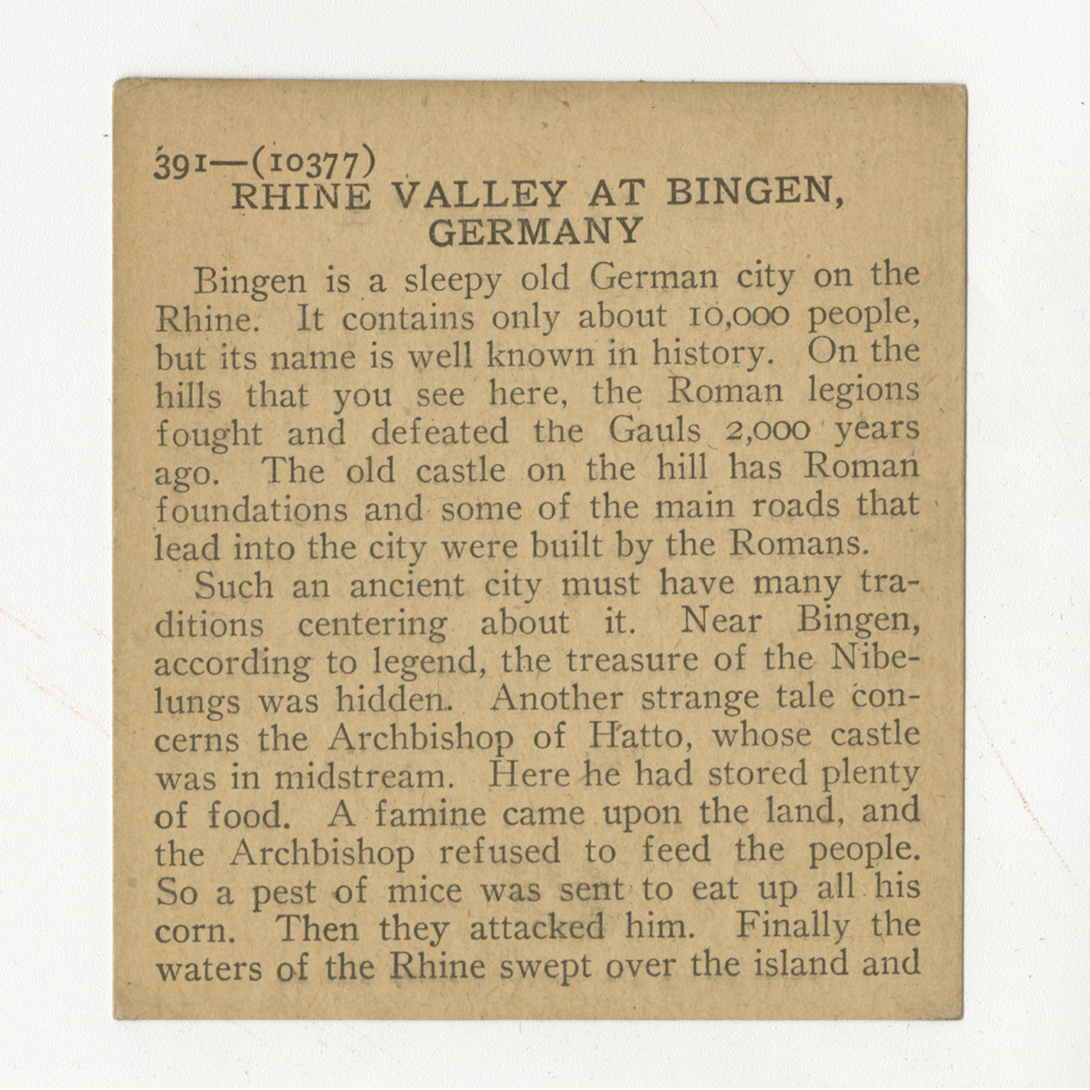 Bingen is a sleepy old Germany city on the Rhine. It contains only about 10,000 people, but its name is well known in history. On the hills that you see here, the Roman legions fought and defeated the Gauls 2,000 years ago. The old castle on the hill has Roman foundations and some of the main roads that lead into the city were built by the Romans. Such an ancient city must have many traditions centering about it. Near Bingen, according to legend, the treasure of the Nibelungs was hidden. Another strange tale concerns the Archbishop of Hatto, whose castle was in midstream. Here he had stored plenty of food. A famine came upon the land, and the Archbishop refused to feed the people. So a pest of mice was set to eat up all his corn. Then they attacked him. Finally the waters of the Rhine swept over the island and
