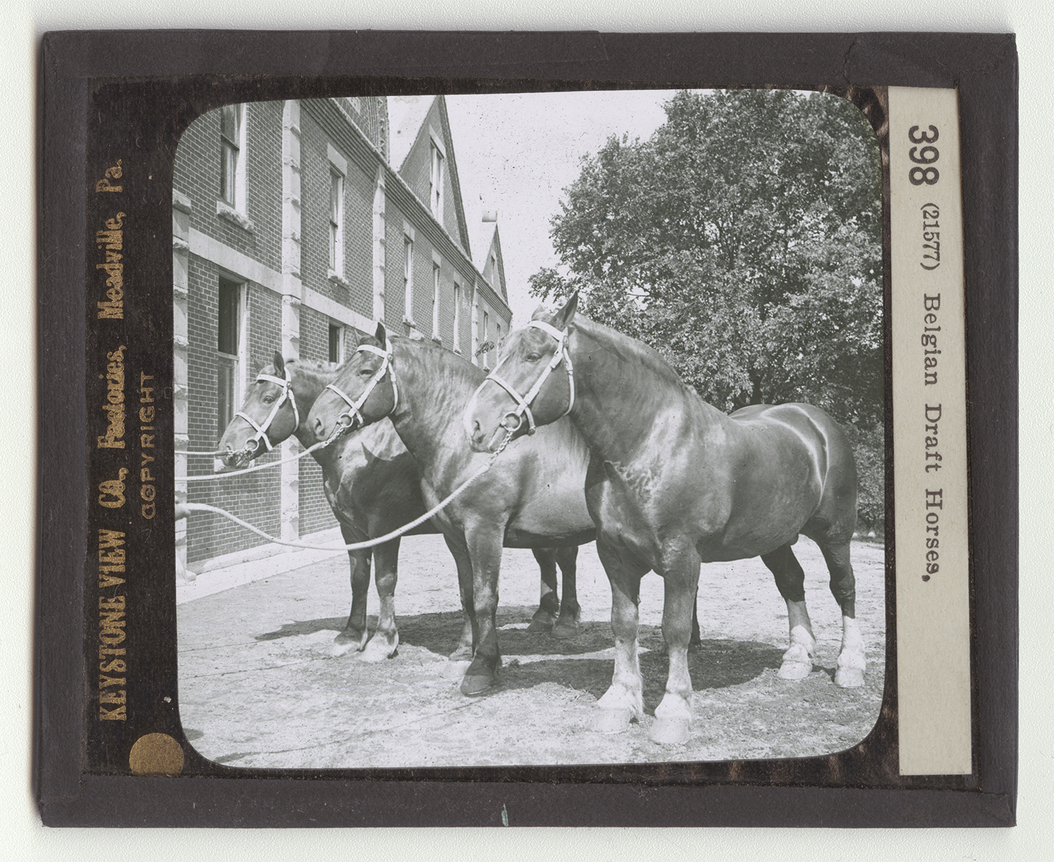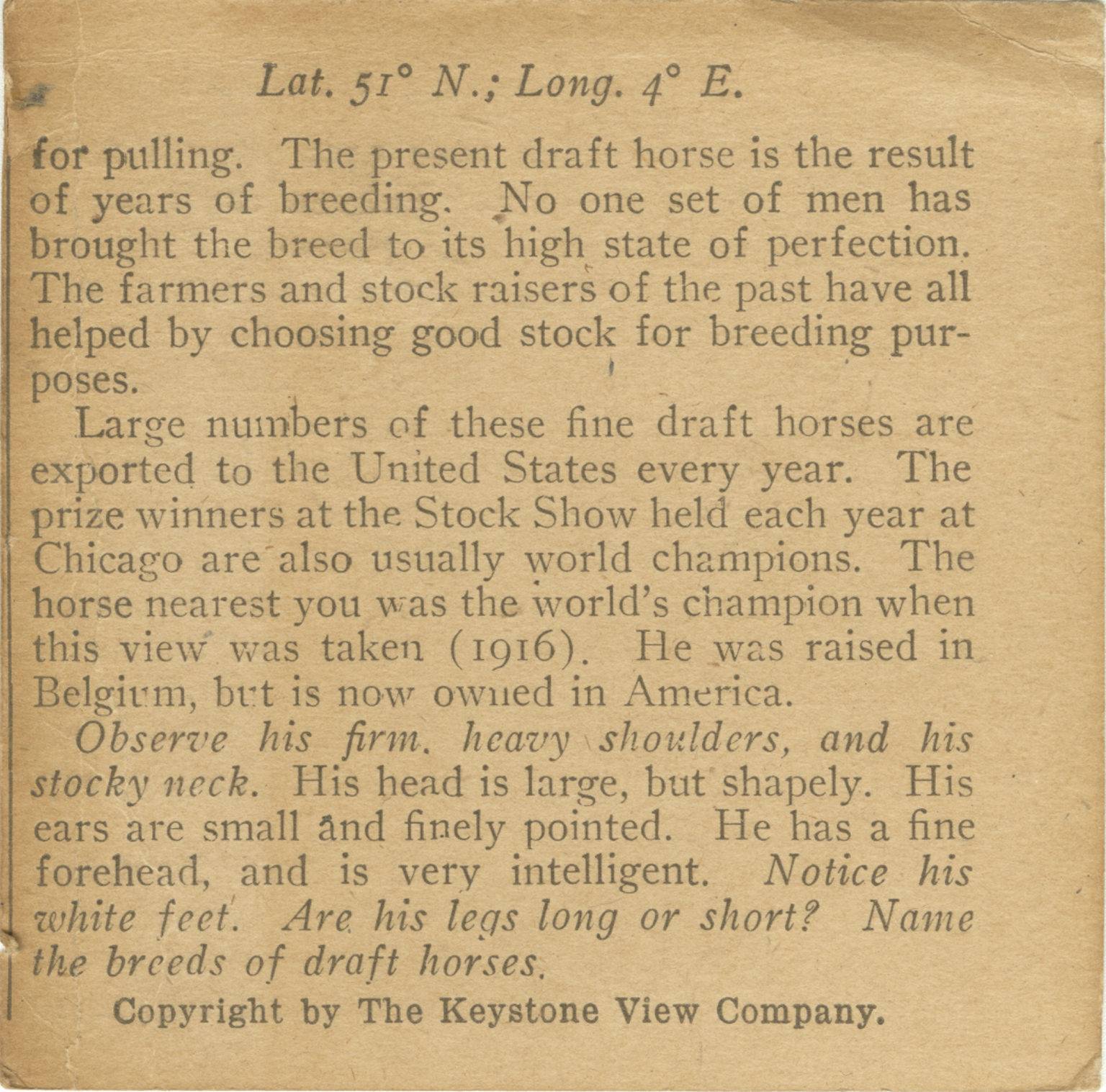for pulling. The present draft horse is the result of years of breeding. No one set of men has brought the breed to its high state of perfection. The farmers and stock raisers of the past have all helped by choosing good stock for breeding purposes. Large numbers of these fine draft horses are exported to the United States every year. The prize winners at the Stock Show held each year at Chicago are also usually world champions. The horse nearest you was the world's champion when this view was taken (1916). He was raised in Belgium, but is now owned in America. Observe his firm, heavy shoulders, and his stocky neck. His head is large, but shapely. His ears are small and finely pointed. He has a fine forehead, and is very intelligent. Notice his white feet. Are his lefs long or short? Name the breeds of draft horses.