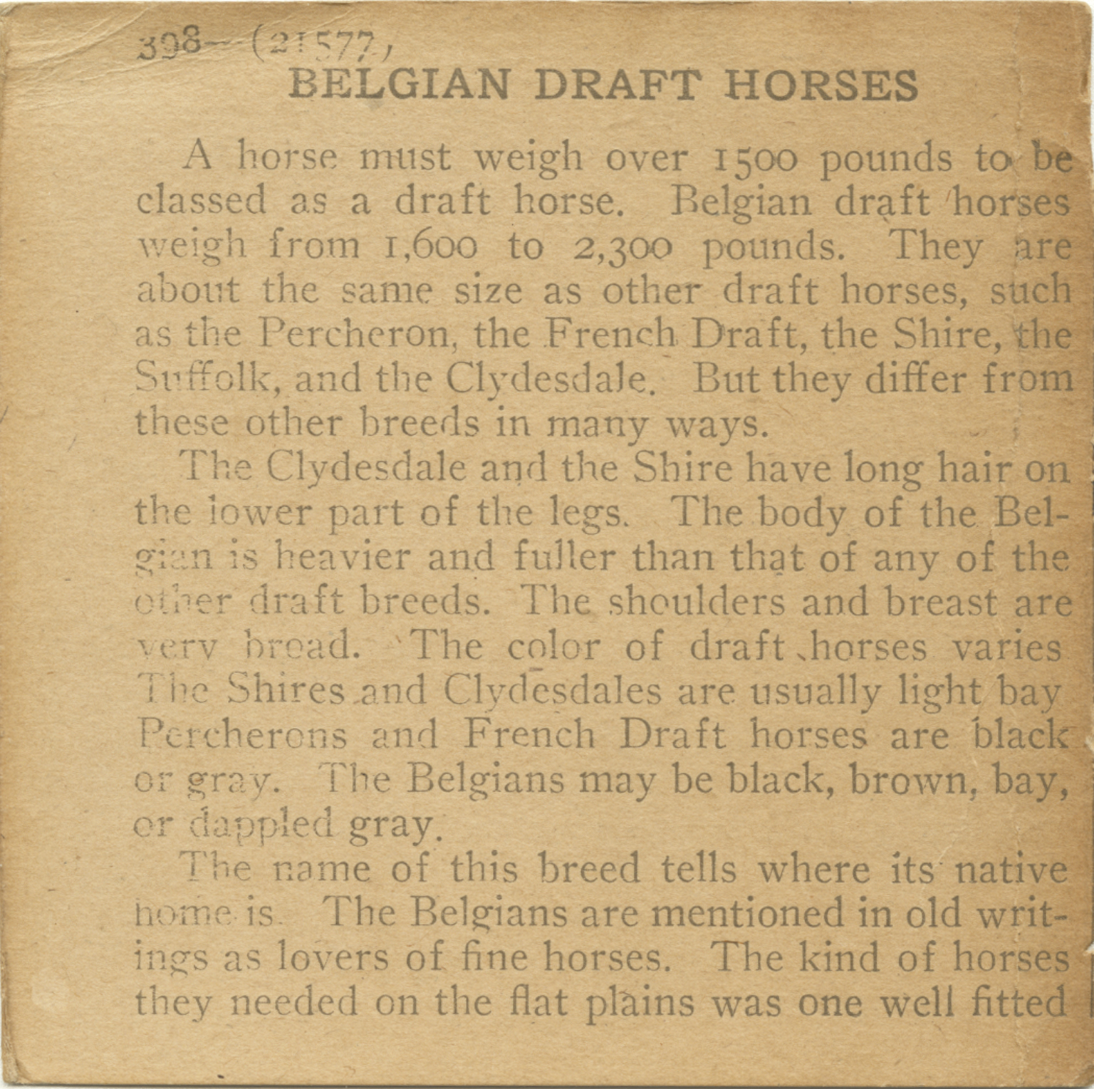 A horse must weigh over 1500 pounds to be classed as a draft horse. Belgian draft horses weigh from 1,600 to 2,300 pounds. They are about the same size as other draft horses, such as the Percheron, the French Draft, the Shire, the Suffolk, and the Clydesdale. But they differ from these other breeds in many ways. The Clydesdale and the Shire have long hair on the lower part of the legs. The body of the Belgian is heavier and fuller than that of any of the other draft breeds. The shoulders and breast are very broad. The color of draft horses varies. The Shires and Clydesdales are usually light bay. Percherons and French Draft horses are black or gray. The Belgians may be black, brown, bay, or dappled gray. The name of this breed tells where its native home is. The Belgians are mentioned in old writings as lovers of fine horses. The kind of horses they needed on the flat plains was one well fitted