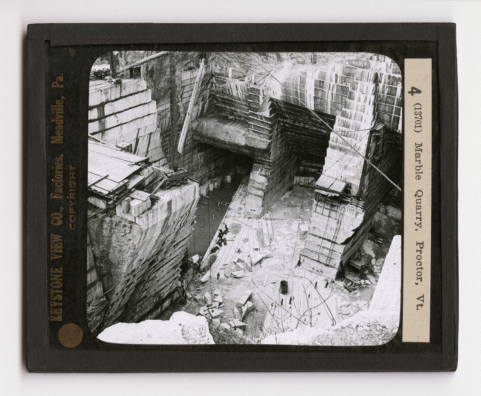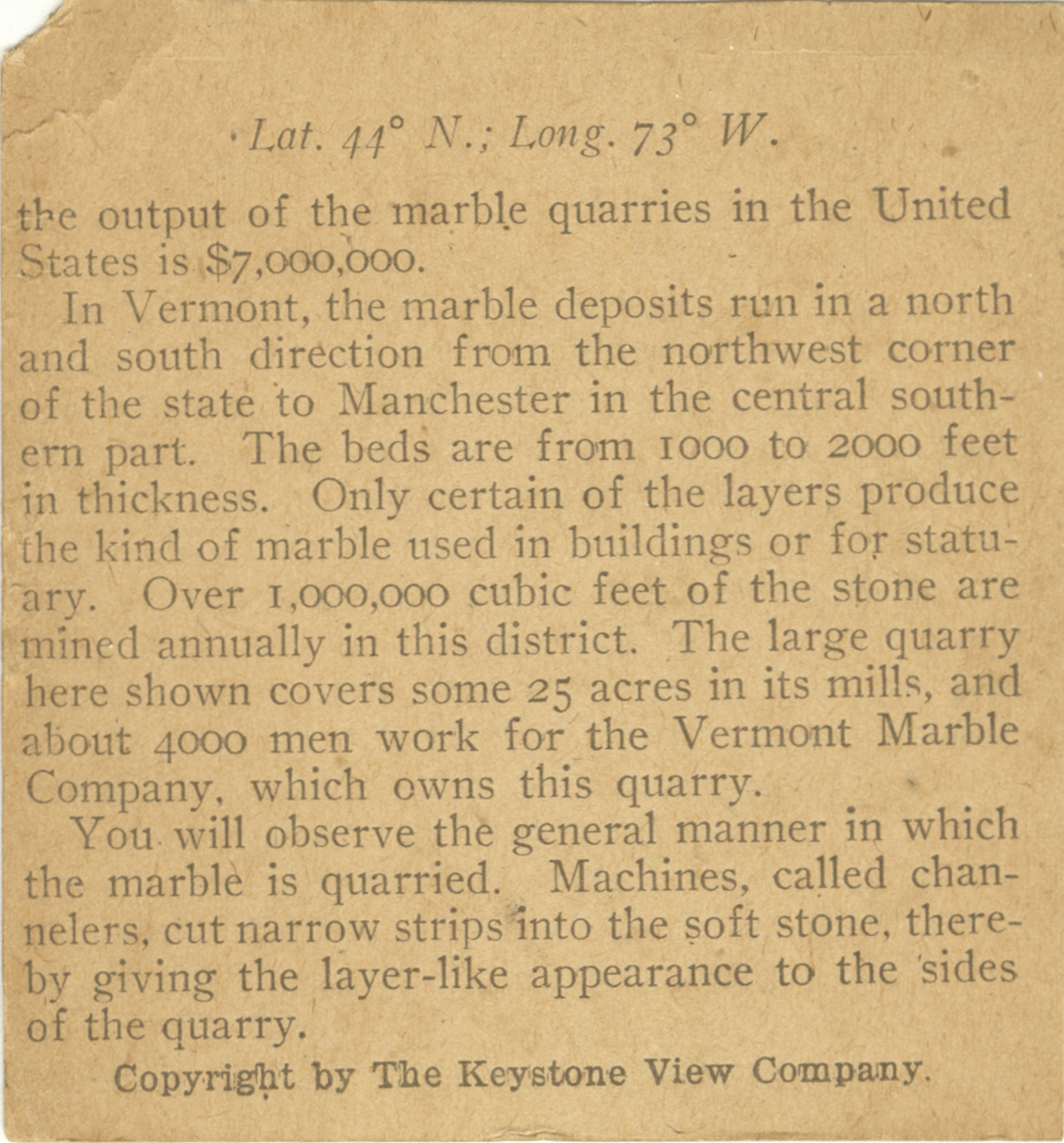 the output of the marble quarries in the United States is $7,000,000. In Vermont, the marble deposits run in a north and south direction from the northwest corner of the state to Manchester in the central southern part. The beds are from 1000 to 2000 feet in thickness. Only certain layers produce the kind of marble used in buildings or for statuary. Over 1,000,000 cubic feet of the stone are mined annually in this district. The large quarry here shown covers some 25 acres in its mills, and about 4000 men work for the Vermont Marble Company, which owns this quarry. You will observe the general manner in which the marble is quarried. Machines, called channelers, cut narrow strips into the soft stone, thereby giving the layer-like appearance to the sides of the quarry.