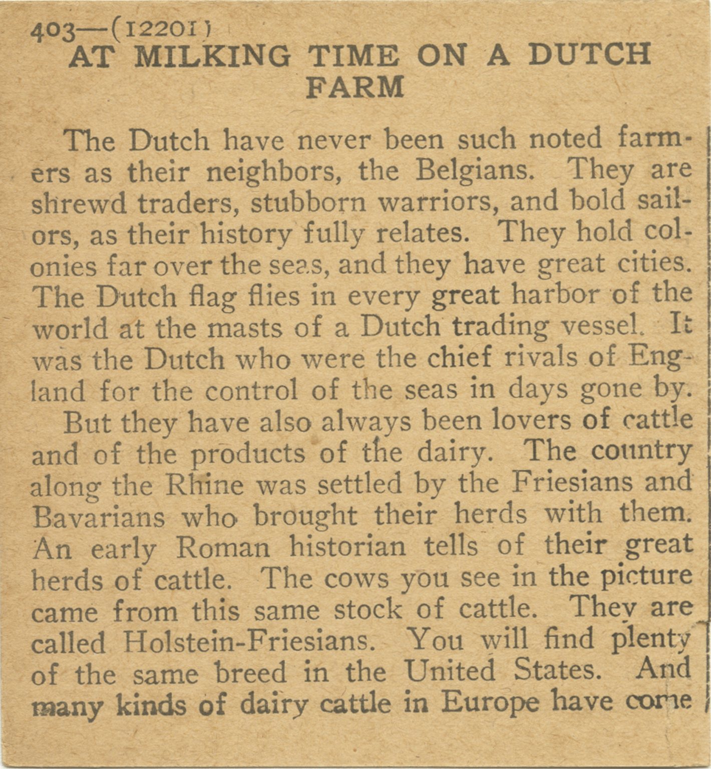 The Dutch have never been such noted farmers as their neighbors, the Belgians. They are shrewd traders, stubborn warriors, and bold sailors, as their history fully relates. They hold colonies far over the seas, and they have great cities. The Dutch flag flies in every great harbor of the world at the masts of a Dutch trading vessel. It was the Dutch who were the chief rivals of England for the control of the seas in days gone by. But they have also always been lovers of cattle and of the products of the dairy. The country along the Rhine was settled by the Friesians and Bavarians who brought their herds with them. Bavarians who brought their herds with them. An early Roman historian tells of their great herds of cattle. The cows you see in the picture came from this same stock of cattle. They are called Holstein-Friesians. You will find plenty of the same breed in the United States. And many kinds of dairy cattle in Europe have come