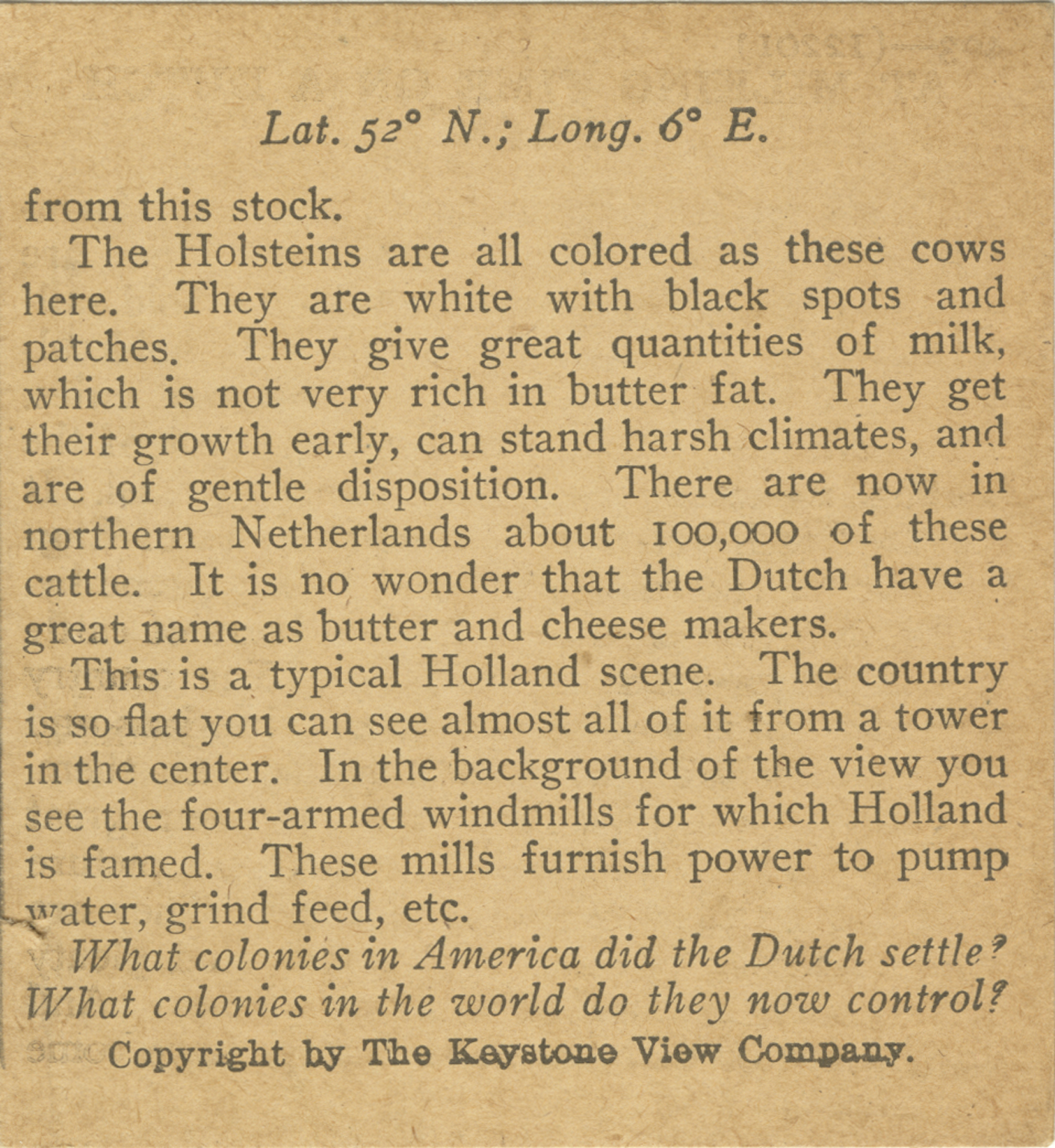 from this stock. The Holsteins are all colored as these cows here. They are white with black spots and patches. They give great quantities of milk, which is not very rich in butter fat. They get their growth early, can stand harsh climates, and are of gentle disposition. There are now in northern Netherlands about 100,000 of these cattle. It is no wonder that the Dutch have a great name as butter and cheese makers. This is a typical Holland scene. The country is so flat you can see almost all of it from a tower in the center. In the background of the view you see the four-armed windmills for which Holland is famed. These mills furnish power to pump water, grind feed, etc. What colonies in America did the Dutch settle? What colonies in the world do they now control?