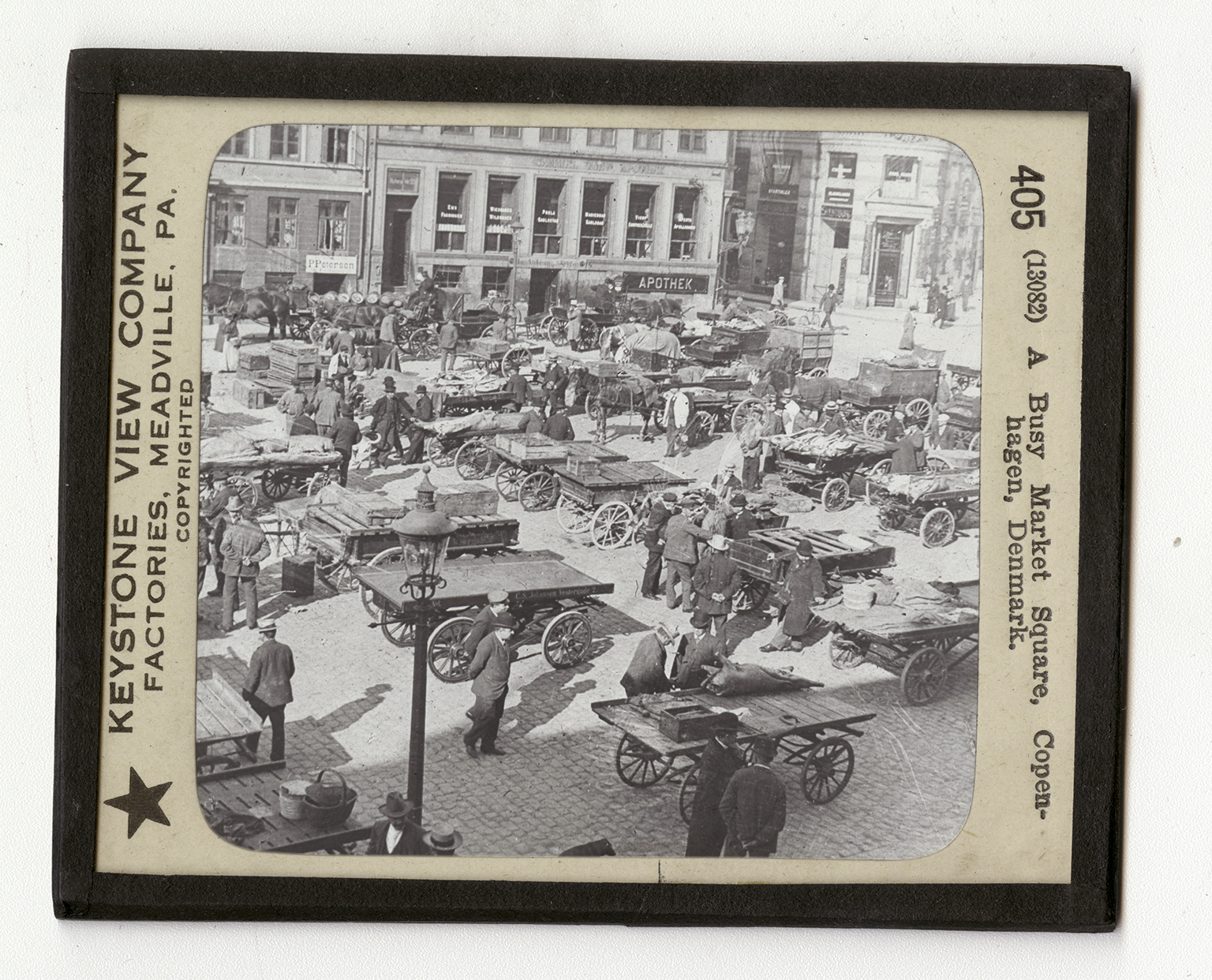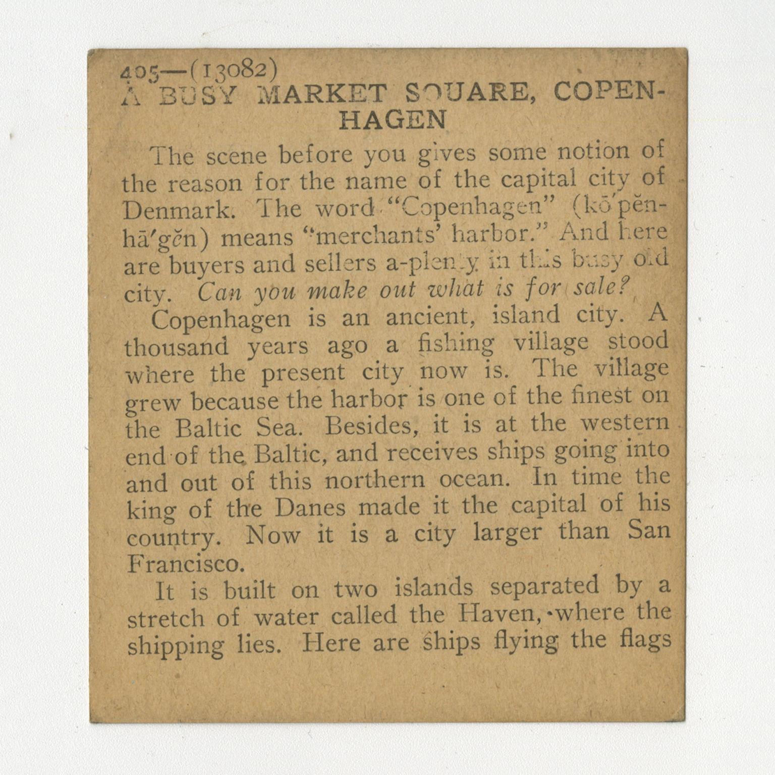 The scene before you gives some notion of the reason for the name of the capital city of Denmark. The word "Copenhagen" means "merchants' harbor." And here are buyers and sellers a-plenty in this busy old city. Can you make out what is for sale? Copenhagen is an ancient, island city. A thousand years ago a fishing village stood where the present city now is. The village grew because the harbor is one of the ginest on the Baltic Sea. Besides, it is at the western end of the Baltic, and receives ships going into and out of this northern ocean. In time the king of the Danes made it the capital of his country. Now it is a city larger than San Francisco. It is built on two islands separated by a stretch of water called the Haven, where the shipping lies. Here are ships flying the flags