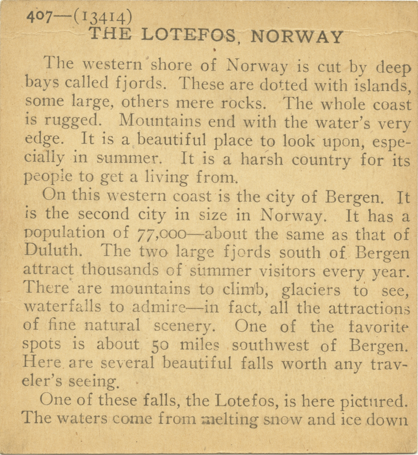 The western shore of Norway is cut by deep boys called fjords. These are dotted with islands, some large, other mere rocks. The whole coast is rugged. Mountains end with the water's very edge. It is a beautiful place to look upon, especially in the summer. It is a harsh country for its people to get a living from. On this western coast is the city of Bergen. It is the second city in size of Norway. It has a population of 77,000 - about the same as that of Duluth. The two large fjords south of Bergen attract thousands of summer visitors every year. There are mountains to climb, glaciers to see, waterfalls to admire - in fact, all the attractions, of fine natural scenery. One of the favorite spots is about 50 miles southwest of Bergen. Here are several beautiful falls worth any traveler's seeing. One of these falls, the Lotefos, is here pictured. The waters come from melting snow and ice down