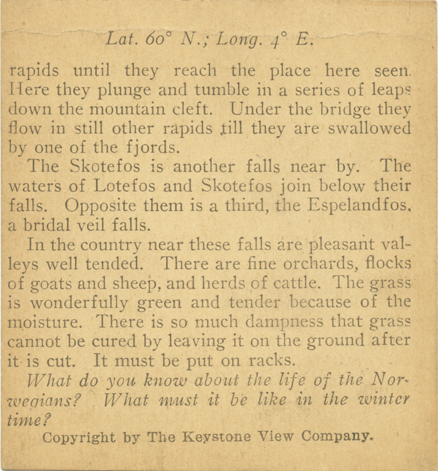 rapids until they reach the place here seen. Here they plunge and tumble in a series of leaps down the mountain cleft. Under the bridge they flow in still other rapids till they are swallowed by one of the fjords. The Skotefos is another falls near by. The waters of Lotefos and Skotefos join below their falls. Opposite them is a third, the Espelandfos, a bridal veil falls. In the country near these falls are pleasant valley well tended. There are fine orchards, flocks of goats and sheep, and herds of cattle. The grass is wonderfully green and tender because of the moisture. There is so much dampness that grass cannot be cured by leaving it on the ground after it is cut. It must be put on racks. What do you know about the life of the Norwegians? What must it be like in the winter time?