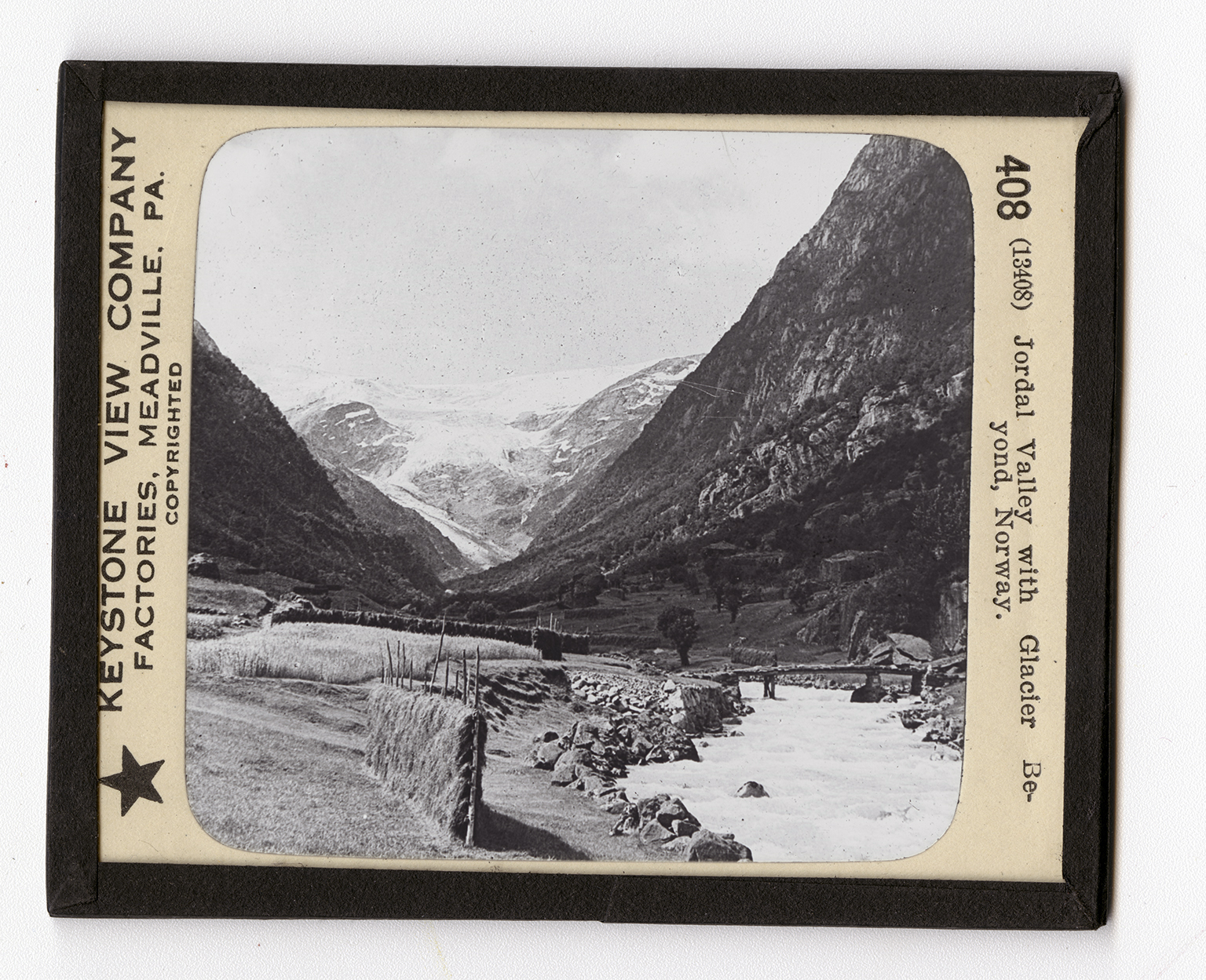 The Jordal is a small stream fed by the melting snow and ice of the Brubra glacier. It is this glacier you see pictured in the background of the view. The river is only a few miles long but it is much visited by tourists who wish to see the rich valley and the glacier above it. The Brubra is an old glacier, and is much smaller now than it once was. We know this because it has left rows of rocks as it melted. These lines of rocks, called moraines, are in the Jordal valley, much below the foot of the glacier as we see it today. Some of the glaciated rocks can be seen by the side of the river. The ice field of the glacier is much smaller than that of some other glaciers in Norway. It is well-known chiefly because it is easy to get to. More interesting, perhaps, than the glacier is the valley itself. The uplands of the valley are covered with heavy wood. The upper reaches of