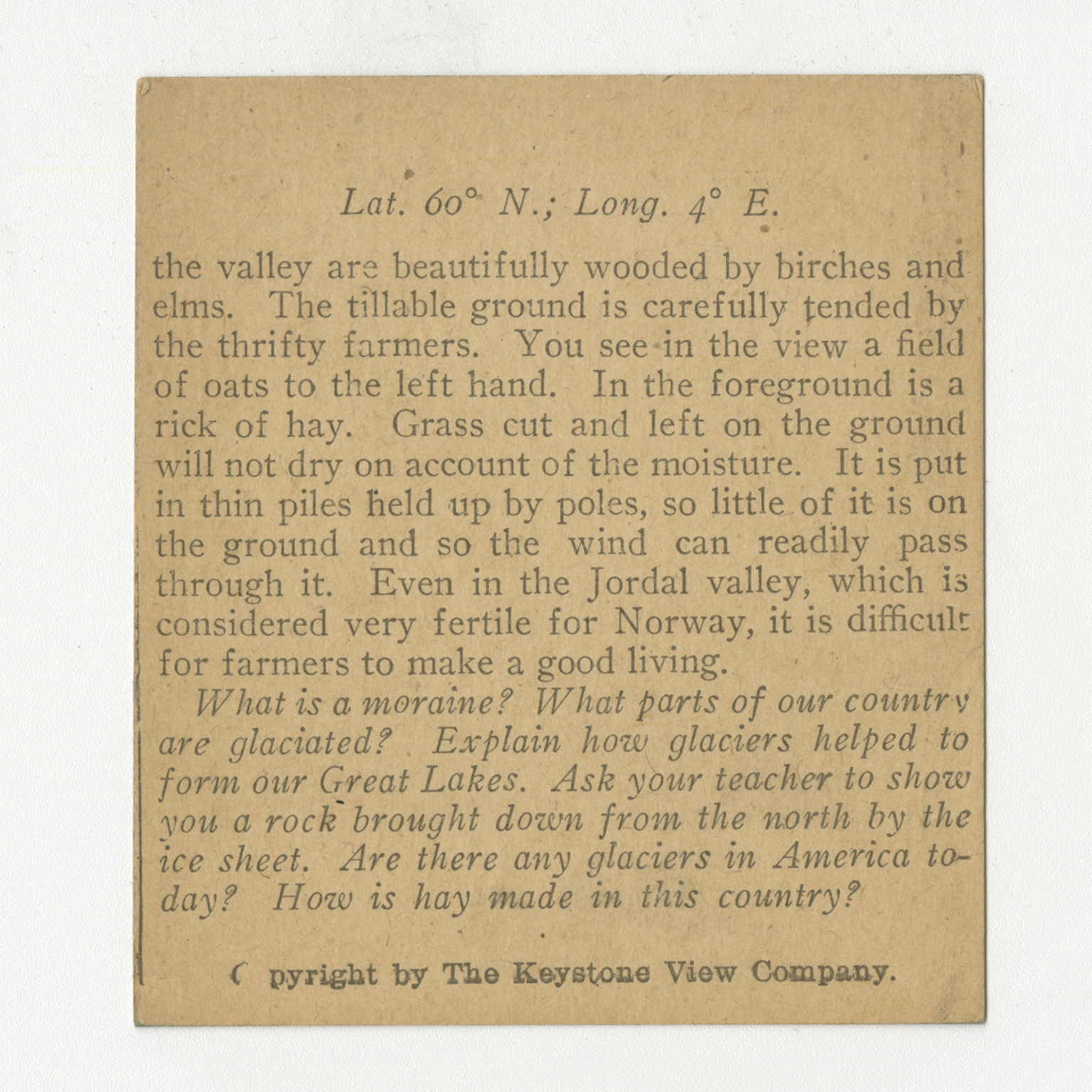 they valley are beautifully wooded by birches and elms. The tillable ground is carefully tended by the thrifty farmers. You see in the view a field of oats to the left hand. In the foreground is a rick of hay. Grass cut and left on the ground will not dry on account of the moisture. It is put in thin piles held up by poles, so little of it is on the ground and so the wind can readily pass through it. Even in the Jordal valley, which is considered very fertile for Norway, it is difficult for farmers to make a good living. What is a moraine? What parts of our country are glaciated? Explain how glaciers helped to form our Great Lakes. Ask your teacher to show you a rock brough down from the north by the ice sheet. Are there any glaciers in America today? How is hay made in this country?
