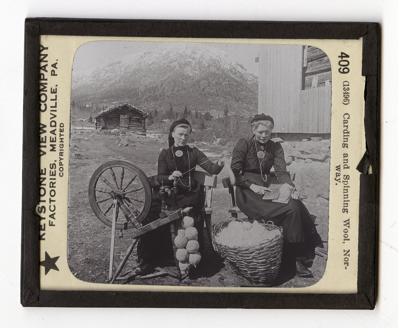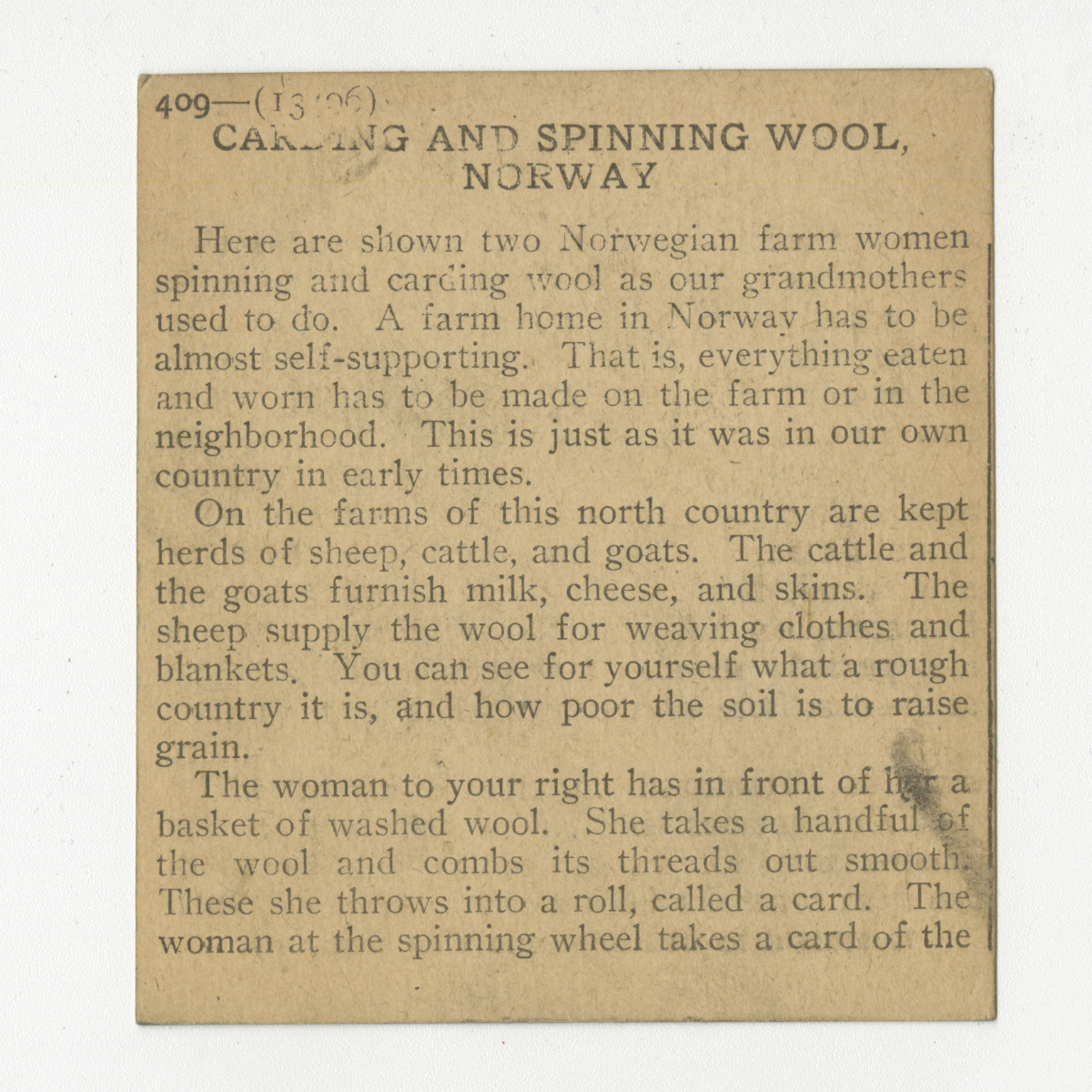 Here are shown two Norwegian farm women spinning and carding wool as our grandmothers used to do. A farm home in Norway has to be almost self-supporting. That is, everything eaten and worn has to be made on the farm or in the neighborhood. This is just as it was in our own country in early times. On the farms of this north country are kept herds of sheep, cattle, and goats. The cattle and the goats furnish milk, cheese, and skins. The sheep supply the wool for weaving clothes and blankets. You can see for yourself what a rough country it is, and how poor the soil is to raise grain. The woman to your right has in front of her a basket of washed wool. She takes a handful of the wool and combs its threads out smooth. These she throws into a roll, called a card. The woman at the spinning wheel takes a card of the
