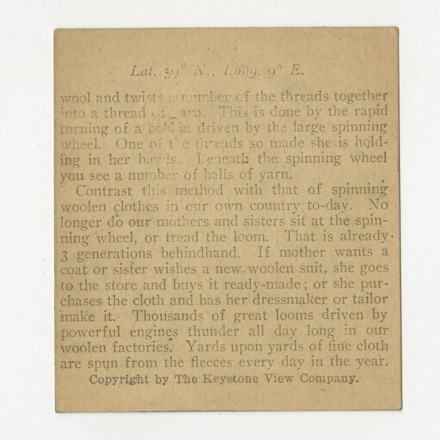 wool and twists a number of the threads together into a thread of ----. This is done by the rapid turning of a bohning driven by the large spinning wheel. One of the threads so made she is holding in her hands. Beneath the spinning wheel you see a number of balls of yarn. Contrasts this method with that of spinning woolen clothes in our own country to-day. No longer do our mothers and sisters sit at the spinning wheel, or tread the loom. That is already 3 generations behindhand. If mother wants a coat or sister wishes a new woolen suit, she goes to the store and buys it ready-made; or she purchases the cloth and has her dressmaker or tailor make it. Thousands of great looms driven by powerful engines thunder all day long in our woolen factories. Yards upon yards of fine cloth are spun from the fleeces every day in the year.