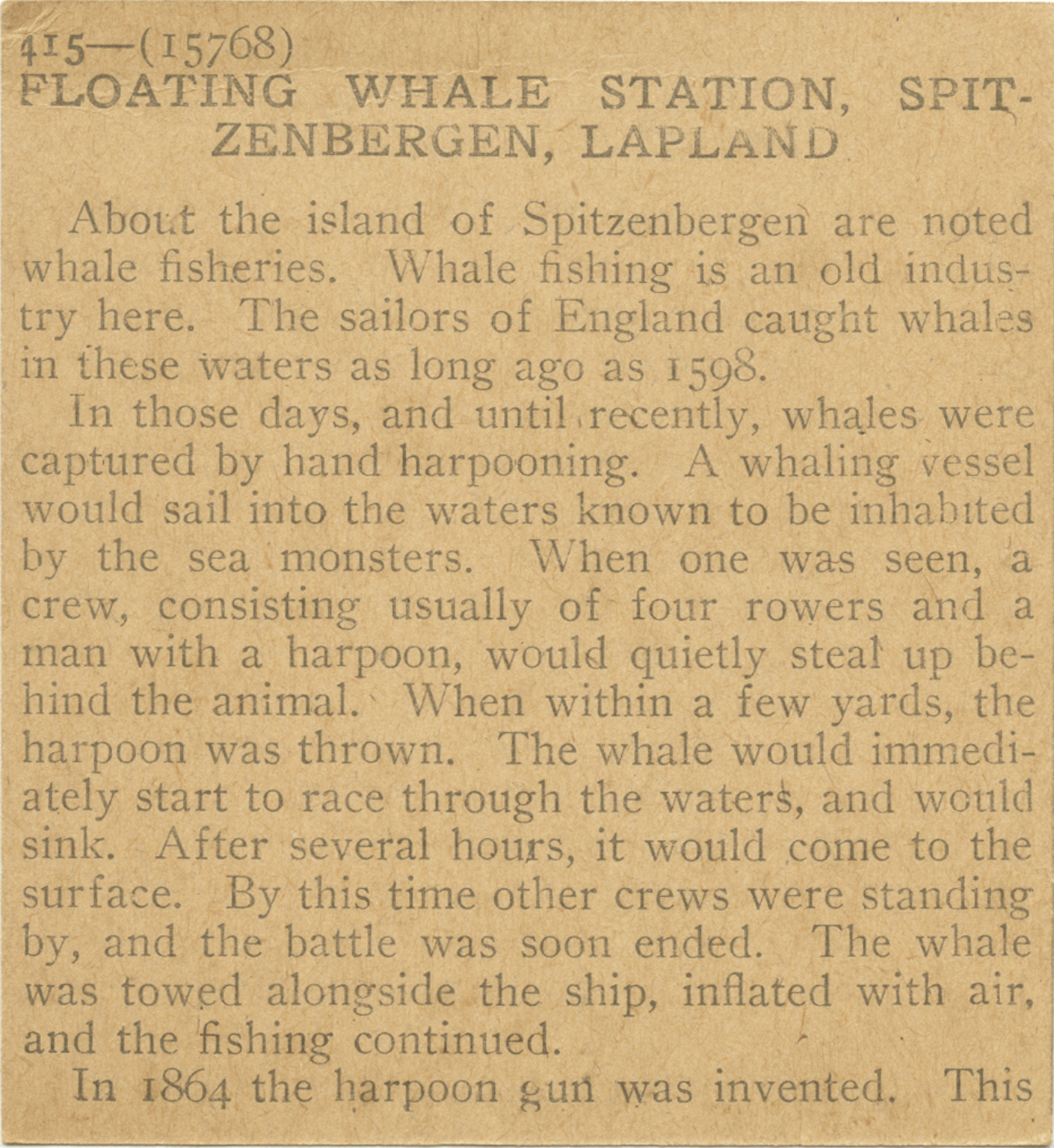 About the island of Spitzenbergen are noted whale fisheries. Whale fishing is an old industry here. The sailors of England caught whales in these water as long ago as 1598. In those days, and until recently, whales were captured by hand harpooning. A whaling vessel would sail into the waters known to be inhabited by the sea monsters. When one was seen, a crew, consisting usually of four rowers and a man with a harpoon, would quietly steal up behind the animal. When withing a few yards, the harpoon was thrown. The whale would immediately start to race through the waters, and would sink. After several hours, it would come to the sufrace. By this time time other crews were standing by, and the battle was soon ended. The whale was towed alongside the ship, inflated with air, and the fishing continued. In 1864 the harpoon was invented. This