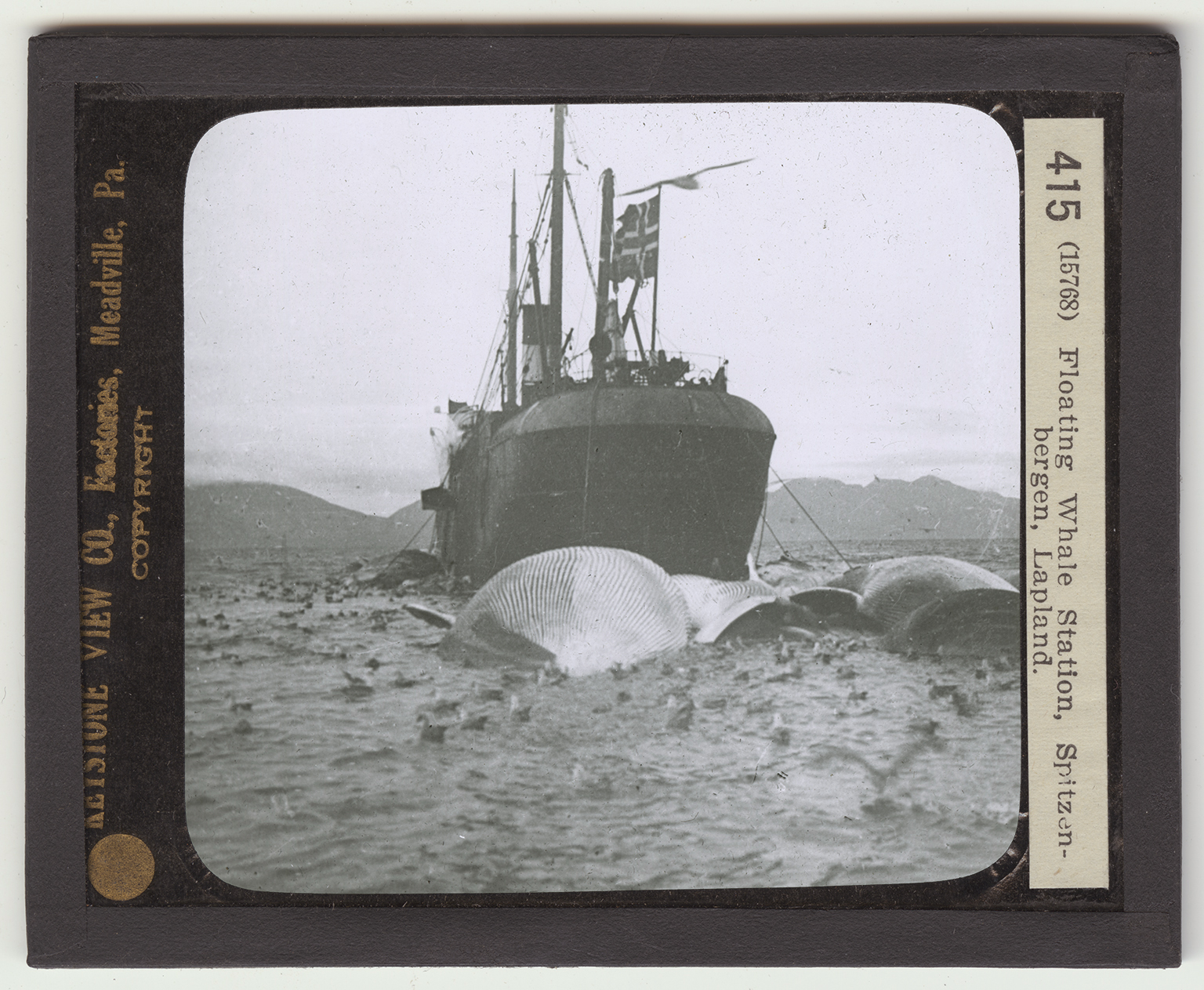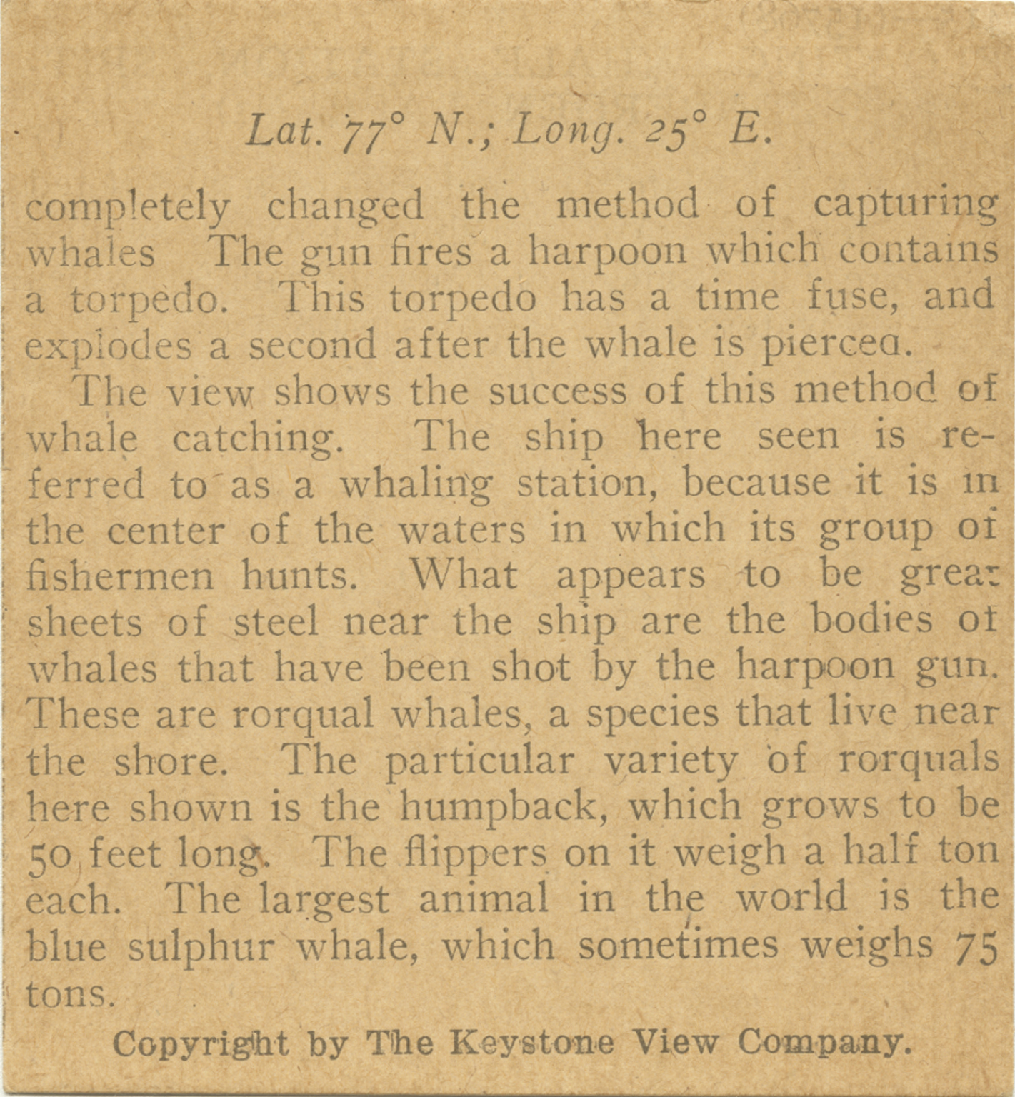 completely changed the method of capturing whales. The gun fires a harpoon which contains a torpedo. This torpedo has a time fuse, and explodes a second after the whale is pierced. The view shows the success of this method of whale catching. The ship here seen is referred to as a whaling station, because it is in the center of the waters in which its group or fishermen hunts. What appears to be great sheets of steel near the ship are the bodies of whales that have been shot by the harpoon gun. These are rorqual whales, a species that live near the shore. The particular variety of rorquals here shown is the humpback, which grows to be 50 feet long. The flippers on it weigh a half ton each. The largest animal in the world is the blue sulphur whale, which sometimes weighs 75 tons.