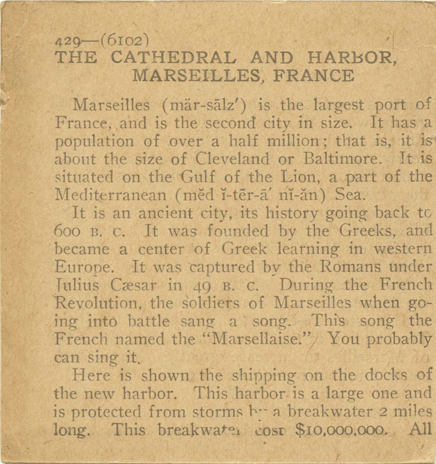 Marseilles is the largest port of France, and is the second city in size. It has a population of over a half million; that is, it is about the size of Cleveland or Baltimore. It is situated on the Gulf of the Lion, a part of the Mediterranean Sea. It is an ancient city, its history going back to 600 B.C. It was founded by the Greeks and became a center of Greek learning in western Europe. It was captured by the Romans under Julius Caesar in 49 B.C. During the French Revolution, the soldiers of Marseilles when going into battle sang a song. This song the French named the "Marsellaise." You probably can sing it. Here is shown the shipping on the docks of the new harbor. This harbor is a large one and is protected from storms by a breakwater 2 miles long. This breakwater cost $10,000,000. All