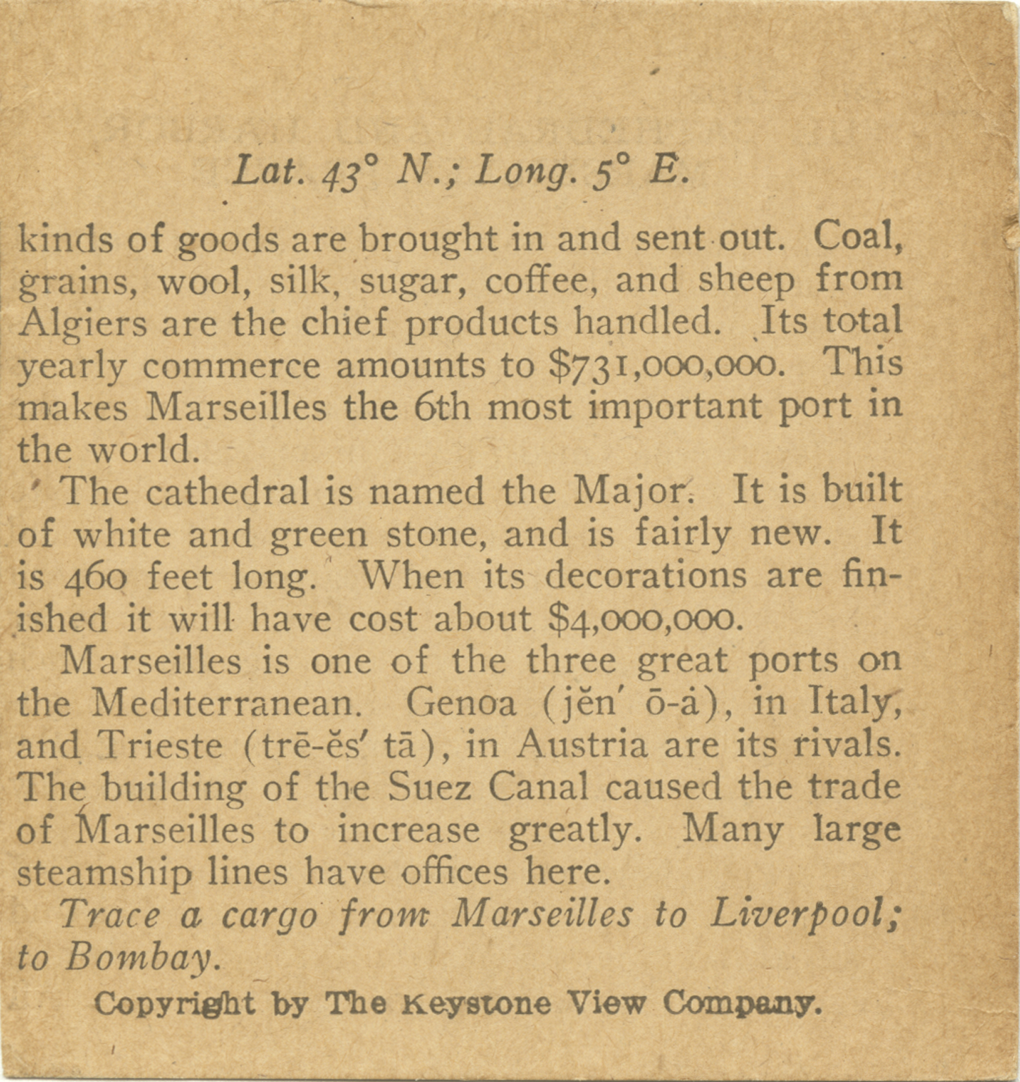 kinds of goods are Brought in and sent out. Coal, grains, woold, silk, sugar, coffee, and sheep from Algiers are the chief products handled. Its total yearly commerce amounts to $731,000,000. This makes Marseilles the 6th most important port in the world. The cathedral is named the Major. It is built of white and green stone, and is fairly new. It is 460 feet long. When its decorations are finished it will have cost about $4,000,000. Marseilles is one of the three great ports on the Mediterranean, Genoa, in Italy, and Trieste, in Austria are its rivals. The building of the Suez Canal caused the trade of Marseilles to increase greatly. Many large steamship lines have offices here. Trace a cargo from Marseilles to Liverpool; to Bombay.