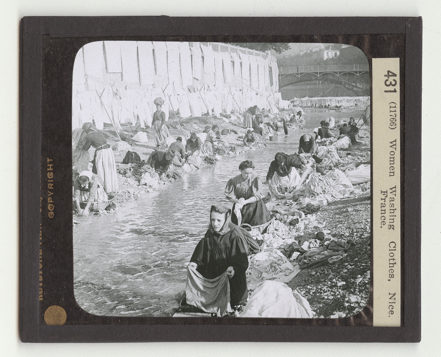 tains back of Nile and flows down the slopes to the sea very rapidly. Heavy rainstorms often occur in these mountains. Immediately the creek becomes a torrent. Woe then to the boatman who pays no attention to weather; or worse yet to the dozens of women washing clothes in the creek. The flood sweeps over everything in its path. Many women have thus been drowned. Now there is a watcher who signals a rise in the river. When the danger signal appears, there is a scramble for the upland. You might think this scene as unusual one even for Nice. It is not. You are not visiting here on a Monday! Any week day is a washday in Nice. The peasant women carry their bundles of clothes to the side of the stream, and proceed with the washing. Great clothes lines are set up on the banks, and these lines are usually filled with garments.