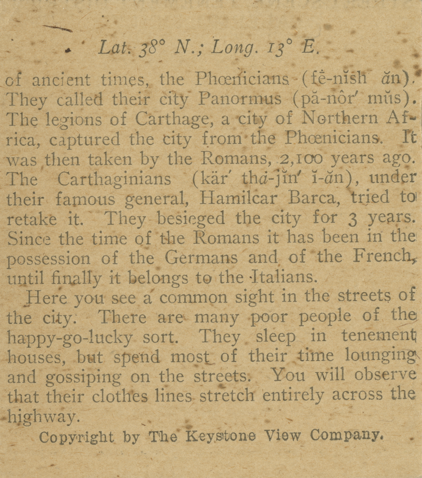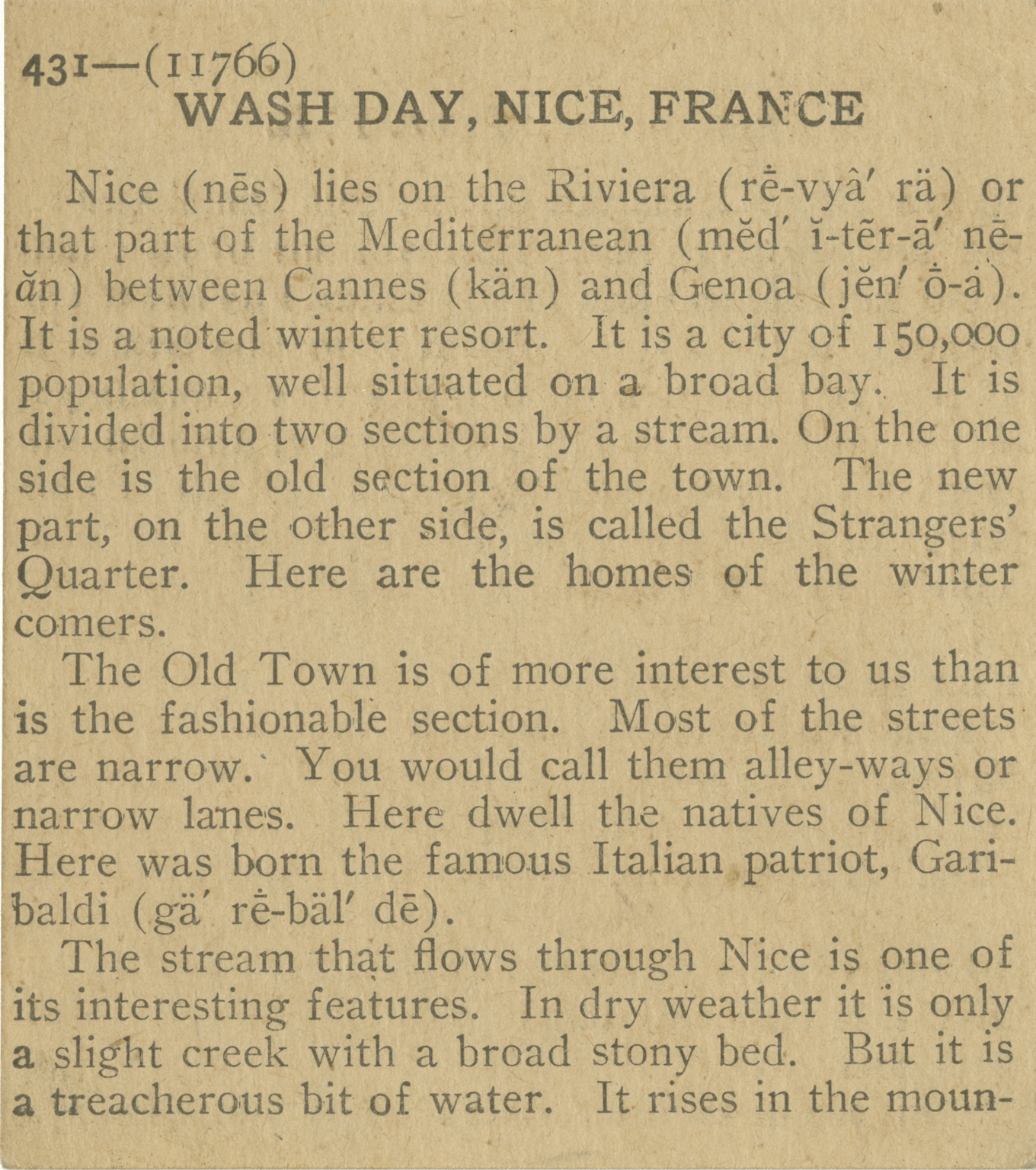Nice lies on the Riviera or that part of the Mediterranean between Cannes and Genoa. It is a noted winter resort. It is a city of 150,000 population, well situated on a broad bay. It is divided into two sections by a stream. On the one side is the old section of the town. The new part, on the other side, is called the Strangers' Quarter. Here are the homes of the winter comers. The Old Town is of more to us than is the fashionable section. Most of the streets are narrow. You would call them alley-ways or narrow lanes. Here dwell the natives of Nice. Here was born the famous Italian partior, Garibaldi. The stream that flows through Nice is one of its interesting features. In dry weather it is only a slight creek with a broad stony bed. But it is a treacherous bit of water. It rises in the mount-