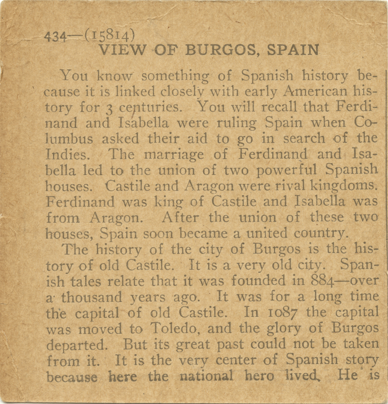 You know something of Spanish history because it is linked closely with early American history for 3 centuries. You will recall that Ferdinand and Isabella were ruling Spain when Columbus asked their aid to go in search of the Indies. The marriage of Ferdinand, and Isabella led to the union of two powerful Spanish houses. Castile and Aragon were rival kingdoms. Ferdinand was king of Castile and Isabella was from Aragon. After the union of these two houses, Spain soon became a united country. The history of the city of Burgos is the history of old Castile. It is a very old city, Spanish tales relate that it was founded in 884 - over a thousand years ago. It was for a long time the capital of old Castile. In 1087 the capital was moved to Toledo, and the glory of Burgos departed. But its great past could not be taken from it. It is the very center of Spanish story because here the national hero lived. He is