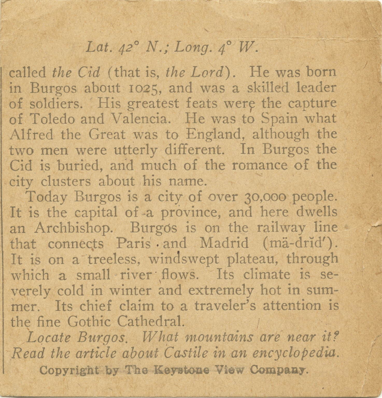 called the Cid (that is, the Lord). He was born in Burgos about 1025, and was a skilled leader of soldiers. His greatest feats were the capture of Toledo and Valencia. He was to Spain what Alfred the Great was to England, although the two men were utterly different. In Burgos the Cid is burried, and much of the romance of the city clusters about his name. Today Burgos is a city of over 30,000 people. It is the capital of a province, and here dwells an Archbishop. Burgos is on the railway line that connects Paris and Madrid (ma-drid'). It is on a treeless, windswept plateau, through which a small river flows. Its climate is severely cold in winter and extremely hot in summer. Its chief claim to a traveler's attention is the fine Gothic Cathedral. Locate Burgos. What mountains are near it? Read the article about Castile in an encyclopedia.