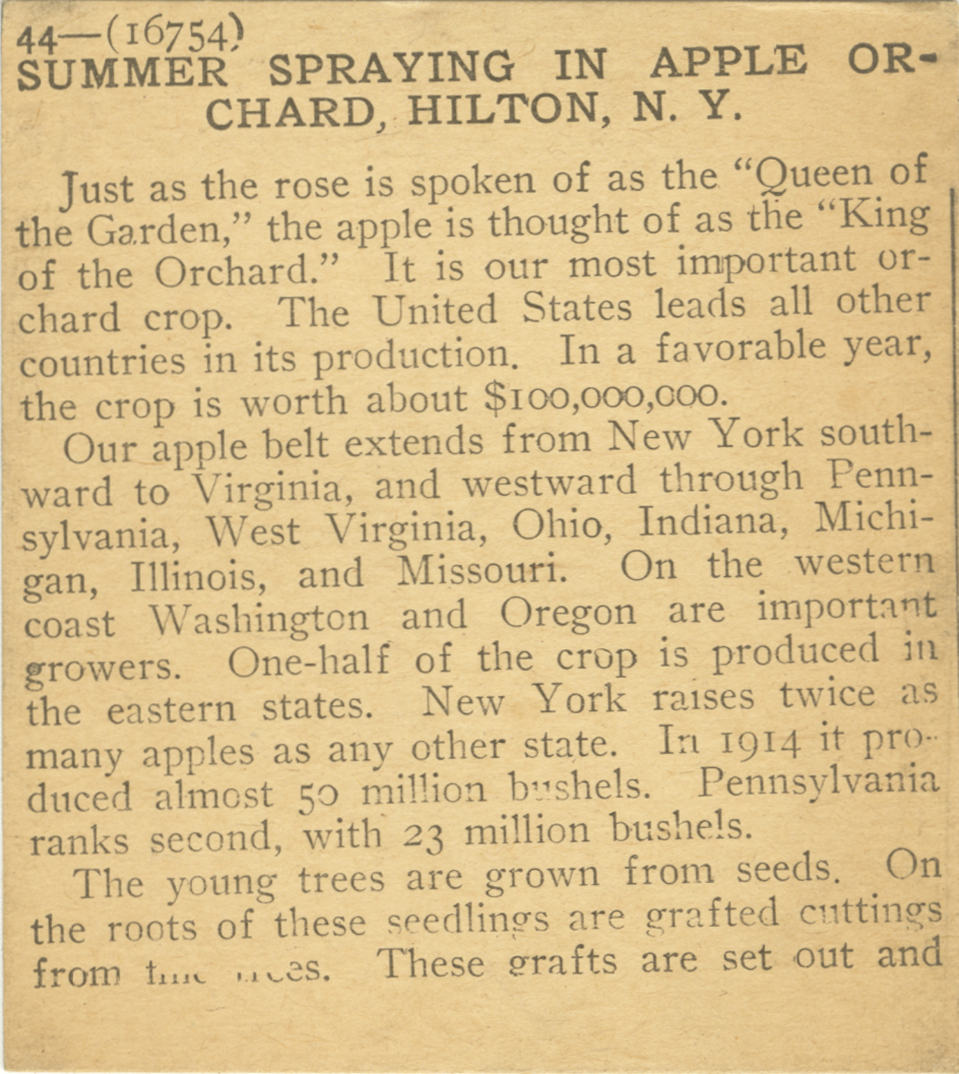 Just as the rose is spoken of as the "Queen of the Garden," the apple is thought of as the "King of the Orchard." It is our most important orchard crop. The United States leads all other countries in its production. In a favorable year, the crop is worth about $100,000,000. Our apple belt extends from New York southward to Virginia, and westward through Pennsylvania, West Virginia, Ohio, Indiana, Michigan, Illinois, and Missouri. On the western coast Washington and Oregon are important growers. One-half of the crop is produced in the eastern states. New York raises twice as many apples as any other state. In 1914 it produced almost 50 million bushels. Pennsylvania ranks second, with 23 million bushels. The young trees are grown from seeds. On the roots of these seedlings are grafted cuttings from the trees. These grafts are set out and