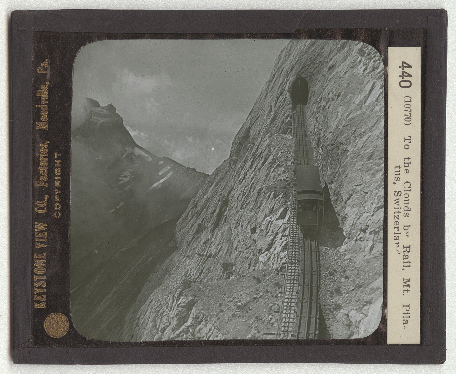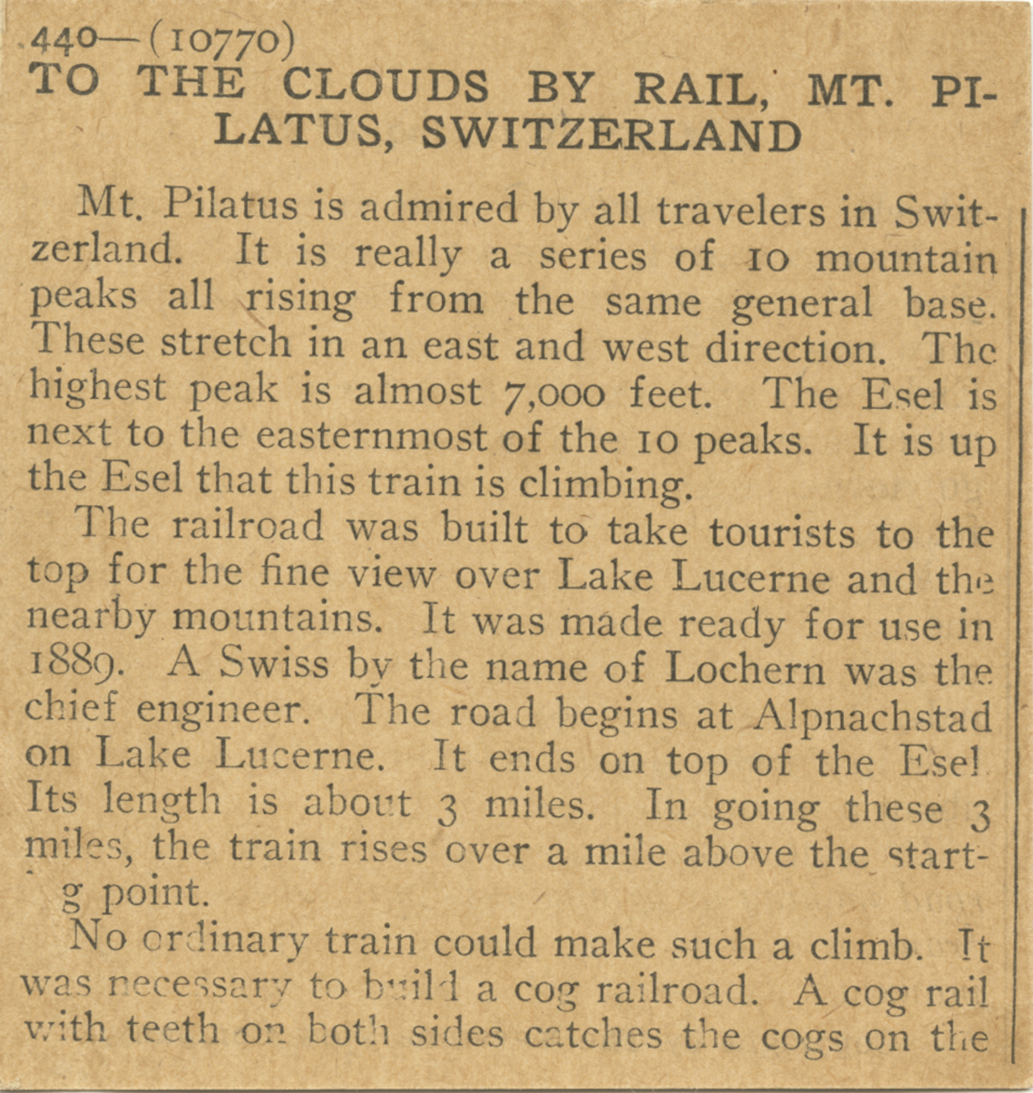 Mt. Pilatus is admired by all travelers in Switzerland. It is really a series of 10 mountains peaks all rising from the same general base. These stretch in an east and west direction. The highest peak is almost 7,000 feet. The Esel is next to the easternmost of the 10 peaks. It is up the Esel that this train is climbing. The railroad was built to take tourists to the top for the fine view over Lake Lucerne and the nearby mountains. It was made ready for use in 1889. A Swiss by the name of Lochern was the chief engineer. The road begins at Alpnachstad on Lake Lucerne. It ends on top of the Esel. Its lenght is about 3 miles. In going these 3 miles, the train rises over a mile above the starting point. No ordinary train could make such a climb. It was necessary to build a cog railroad. A cog rail with teeth on both sides catches the cogs on the