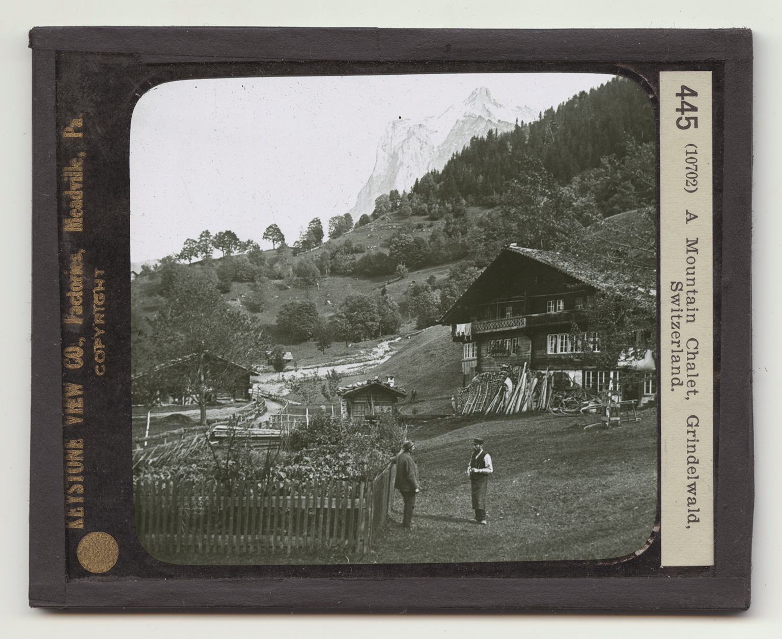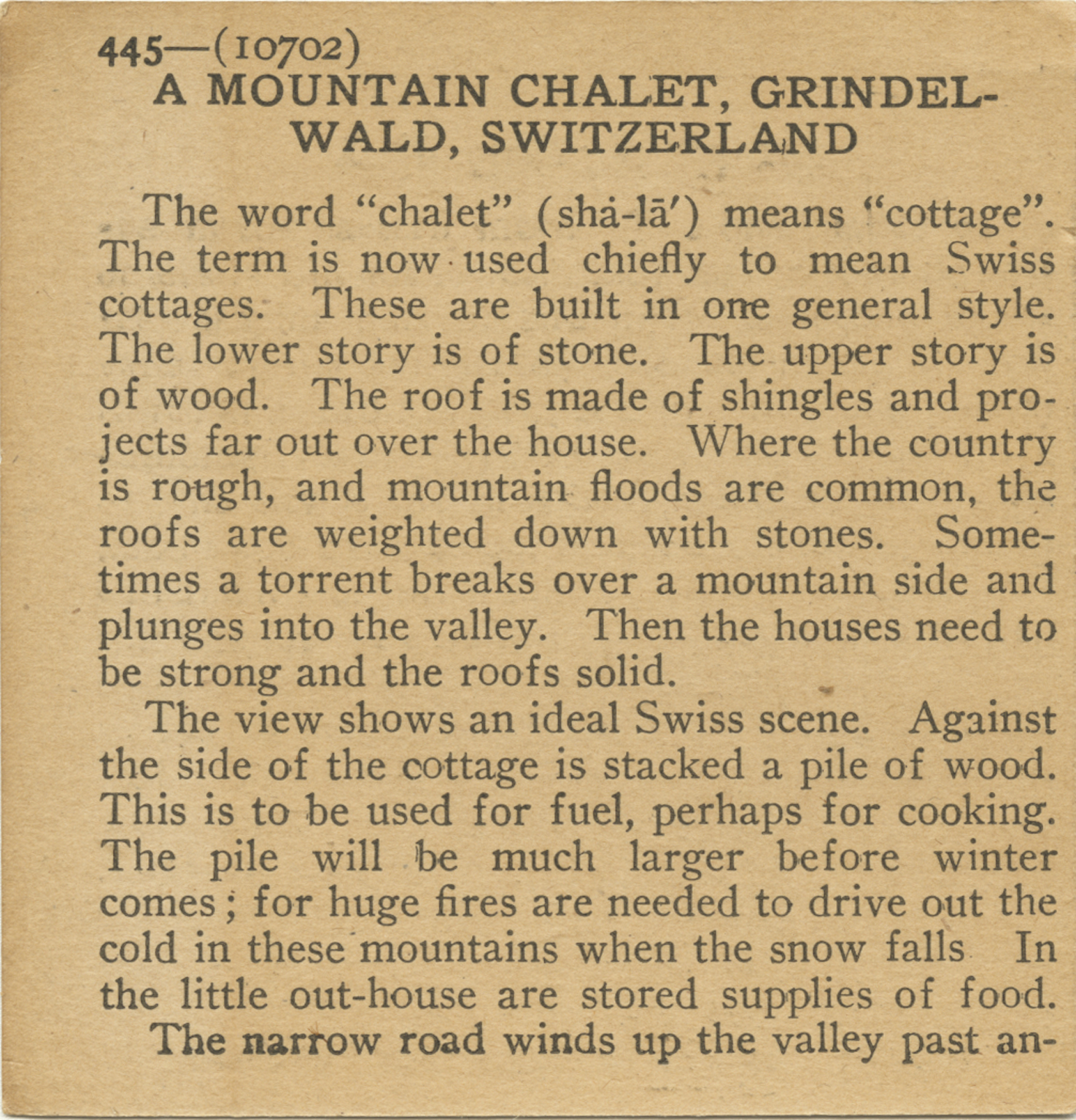 The word "chalet" means "cottage". The term is now used chiefly to mean Swiss cottages. These are built in one general style. The lower story is of stone. The upper story is of wood. The roof is made of shingles and projects far out over the house. Where the country is rough, and mountain floods are common, the roofs are weighted down with stones. Sometimes a torrent breaks over a mountain side and plunges into the valley. Then the houses need to be strong and the roofs solid. The view shows an ideal Swiss scene. Against the side of the cottage is stacked a pile of wood. This is to be used for fuel, perhaps for cooking. The pile will be much larger before winter comes; for huge fres are needed to drive out the cold in these mountains when the snow falls. In the little out house are stored supplies of food. The narrow road winds up the valley past an-