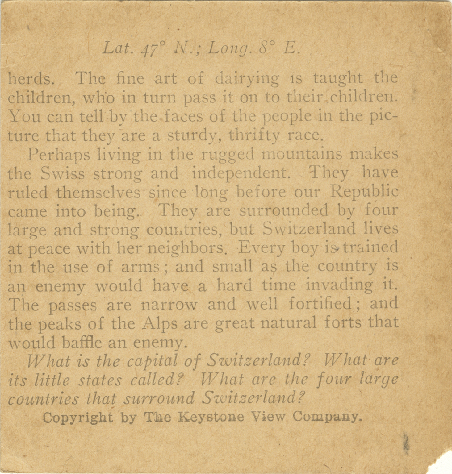 herds. The fine art of dairying is taught the children, who in turn pass it on to their children. You can tell by the facts of the people in the picture that they are a sturdy, thrifty race. Perhaps living in the rugged mountains makes the Swiss strong and independent. They have ruled themselves since long before our Republic came into being. They are surrounded by four large and strong countries, but Switzerland lives at peace with her neighbors. Every boy is trained in the use of arms and small as the country is an enemy would have a hard time invading it. The passes are narrow and well fortified; and the peaks of the Alps are great natural forts that would baffle an enemy. What is the capital of Switzerland? What are its little states called? What are the four large countries that surround Switzerland?