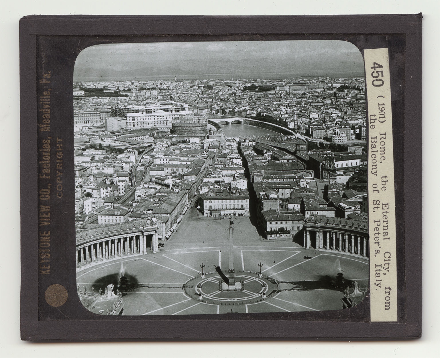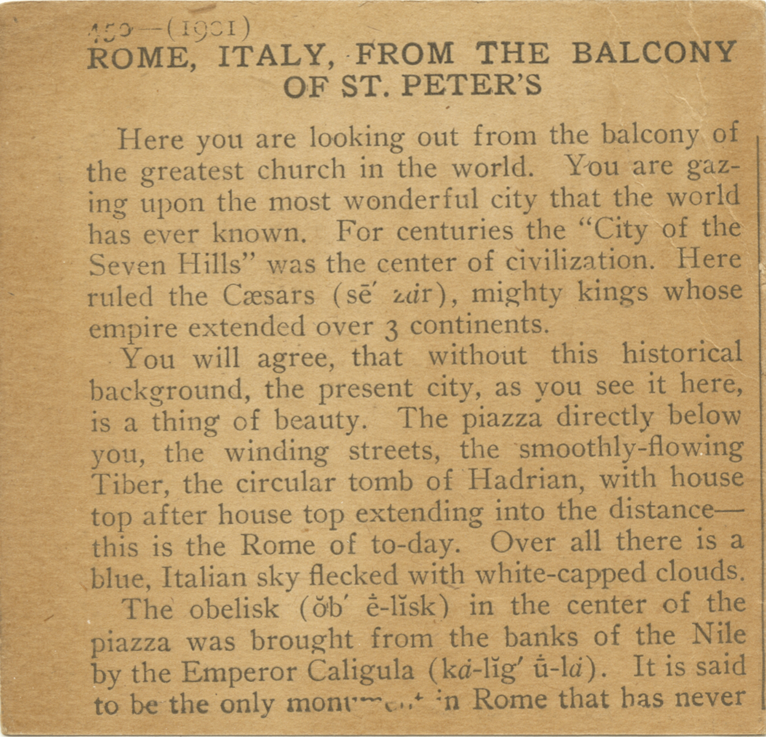 Here you are looking out from the balcony of the greatest church in the world. You are gazing upon the most wonderful city that the world has ever known. For centuries the "City of the Seven Hills" was the center of civilization. Here ruled the Caesars, mighty kings whose empire extended over 3 continents. You will agree, that without this historical background, the present city, as you see it here is a thing of beauty. The piazza directly below you, the winding streets, the smoothlu-flowing Tiber, the circular tomb of Hadrian, with house top after house top extending into the distance - this is the Rome of to-day. Over all there is a blue, Italian sky flecked with white-capped clouds. The obelisk in the center of the piazza was brought from the banks of the Nile by the Emperor Caligula. It is said to be the only monument in Rome that has never