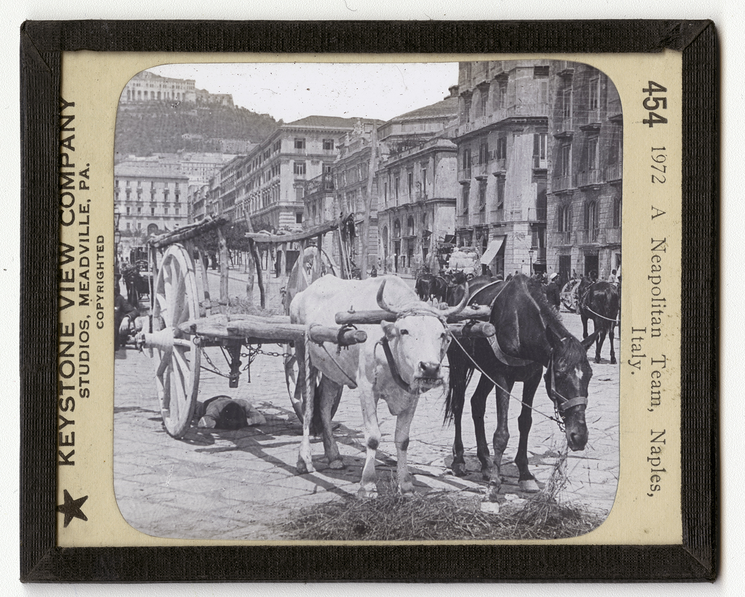 Naples is said to be one of the noisiest cities in Europe. There is a constant shouting of peddlers, clatter of wheels, braying of donkeys, cracking of the whips of the drivers, and their sharp cries to their teams. Beggars run hither and thither, annoying tourists, asking gifts. The team here shown is an unusual one, but one not altogether uncommon in Naples. Both the ox and the horse are enjoying the feed of hay in the middle of the street while the driver is taking a nap in the shade of the trucks of his wagon. Naples was founded by the Greeks, about 2,500 years ago. From the Greeks it passed into the hands of the Romans. While in their possession the greatest men of the ancient world have either visited it or fought to take it. Both Pyrrhus and Hannibal attempted to capture the city. The mighty Augustus Caeser lived here, as did also the poet Virgil.